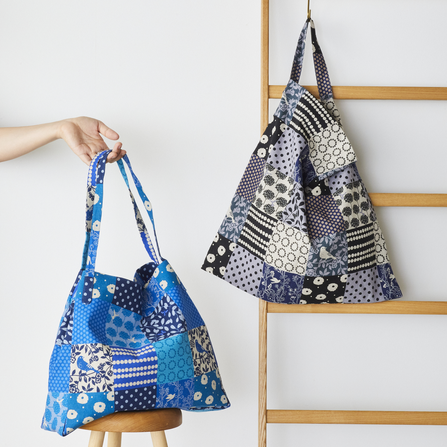 パッチワーク調の1面ごとにテキスタイルパターンや植物や鳥た
