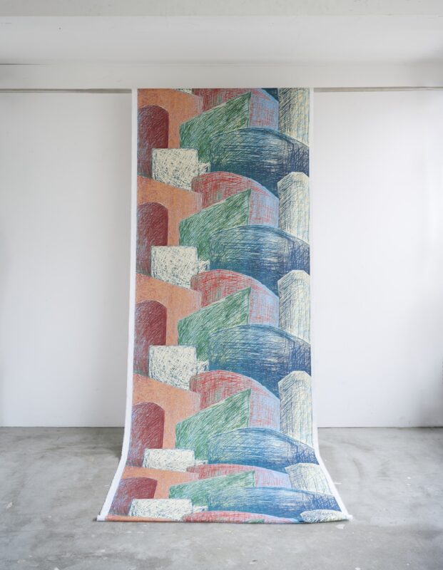 Its patterns are composed of freely drawn, expressive lines capturing everyday scenery—sky, mountains, cityscapes, and more.