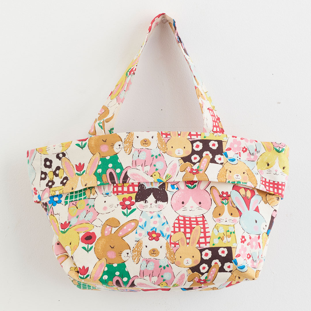 The fabric used for this bag is from the “KONiTT” series, a textile brand that was born from listening to firsthand ideas of handicraft artists. For outer fabrics, “Happa” with sprinkles of leaves, flowers, and berries is used, while “Shima Shima” with loose-looking stripes is featured as the lining fabric and handles. The “Happa” is sheeting and the “Shima” is oxford. These 100% cotton fabrics are both easy to cut and sew, perfect for bag making.