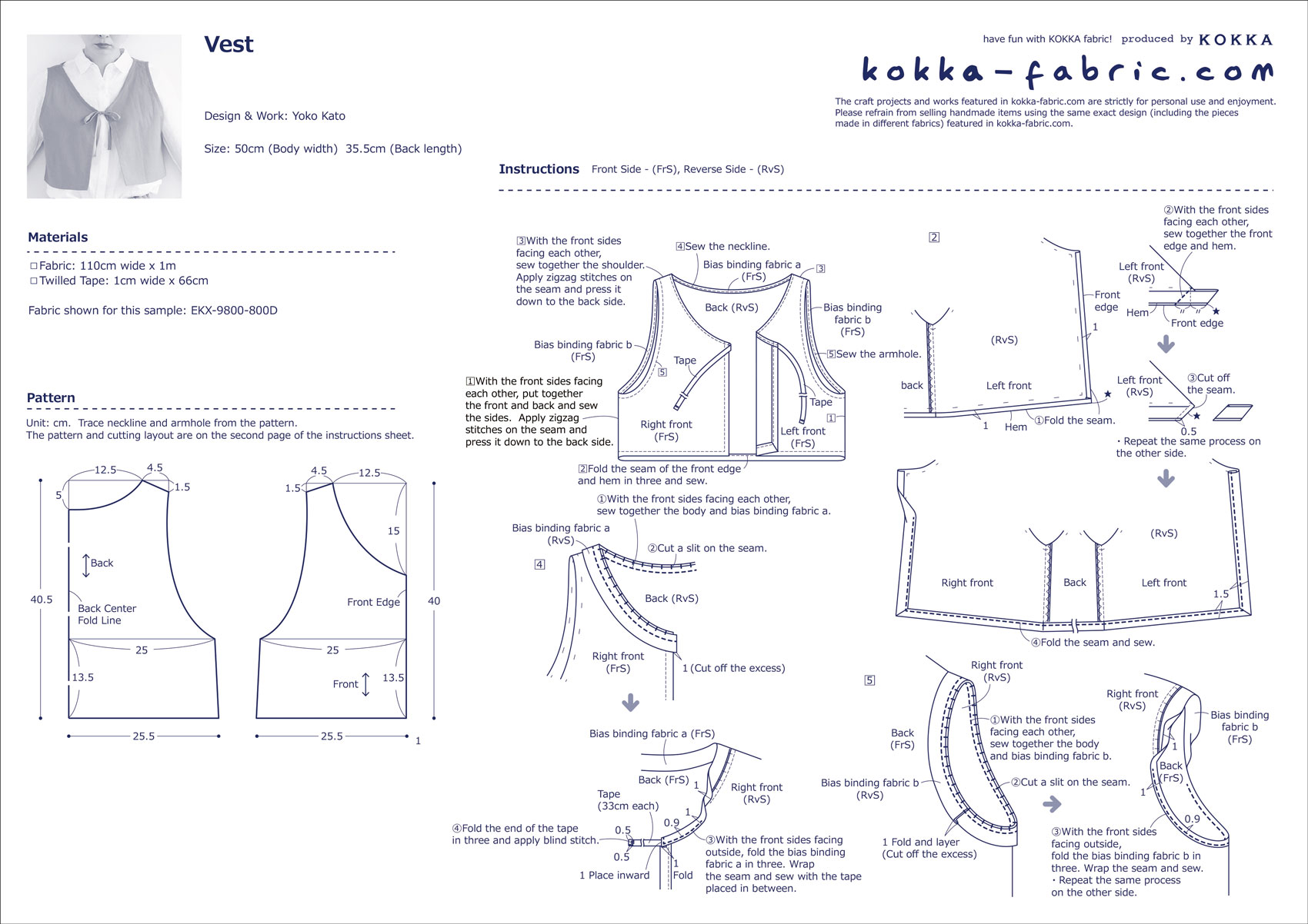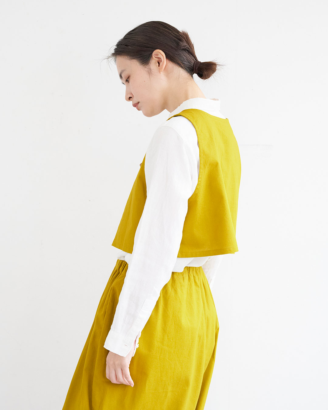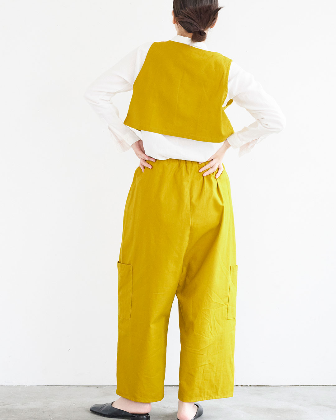 This vest features a cute ribbon tied at the front. Its short length creates the illusion of a higher waistline, making your legs appear longer. With pattern pieces for the armholes and neckline included, even sewing beginners can enjoy a one-day sewing project. The fabric used for this vest is echino’s solid mustard cotton-linen canvas. It is a slightly thicker fabric with nice stiffness.