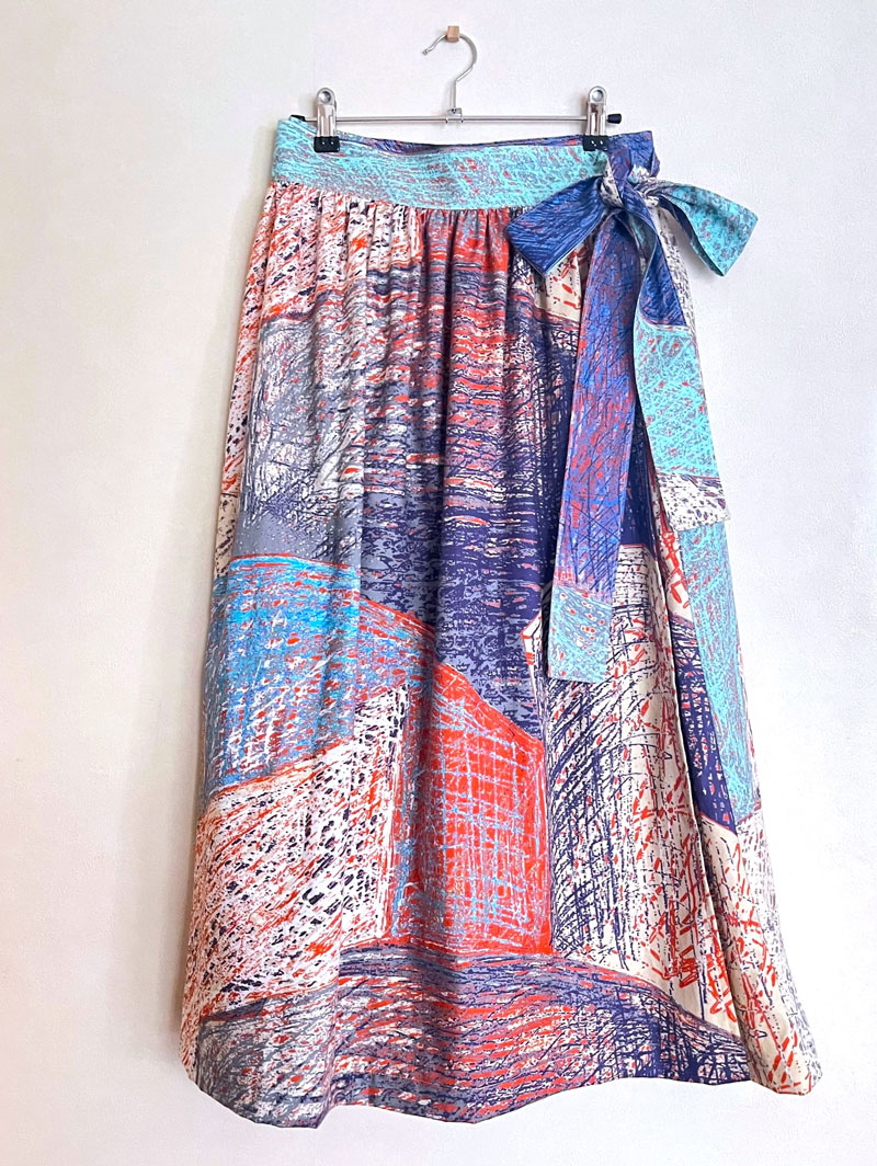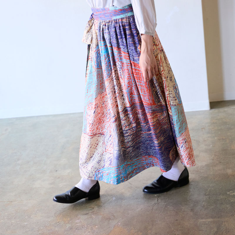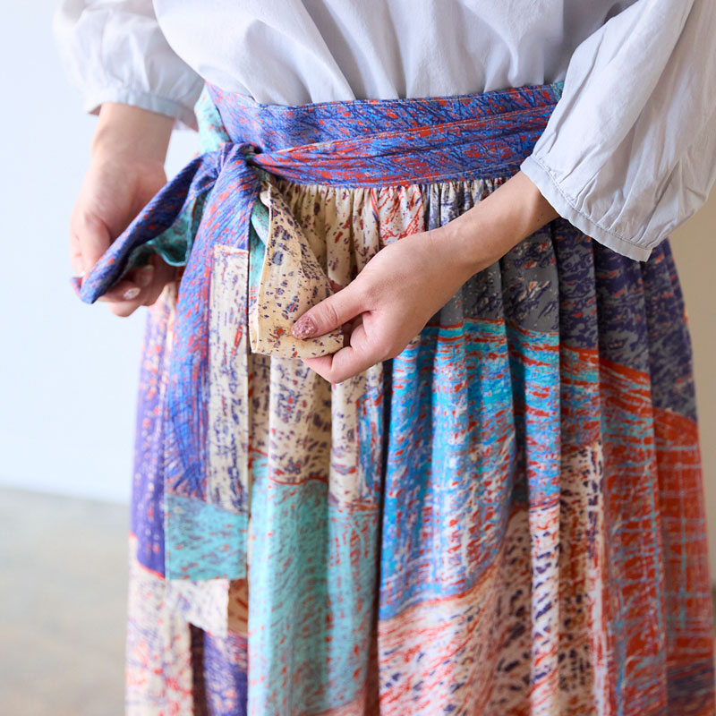 This wrap skirt is made by piecing together two front panels and one back panel. Since it is tied at the waist, you can adjust the fit freely, tighten it or loosen it as desired. The appeal is that it fits a variety of body types. The fabric used for this skirt is KESHIKI’s new pattern “Station City,” created by textile designer Yumi Yoshimoto. Its stylish pattern features a textured feel across the entire surface in a blend of many colors.