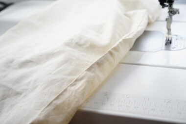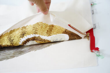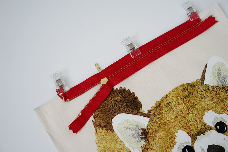 Cut the fabric and attach the zipper to the opening side. With the front sides facing each other, fold the zipper end and baste together with the fabric.