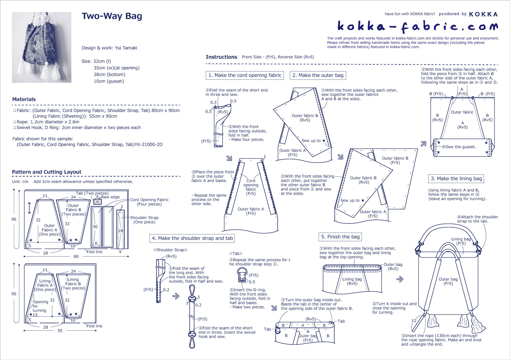 - Fabric: (Outer Fabric, Cord Opening Fabric, Shoulder Strap, Tab) 80cm x 90cm