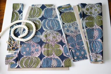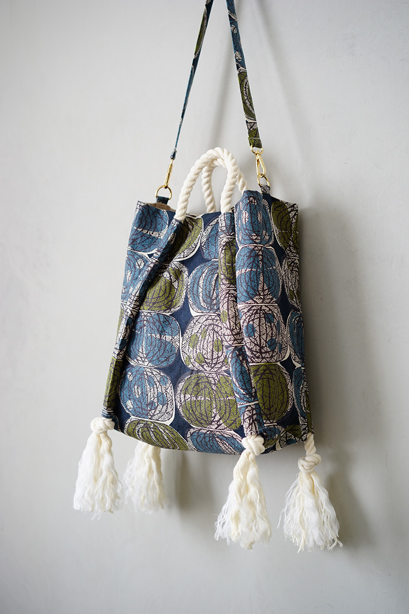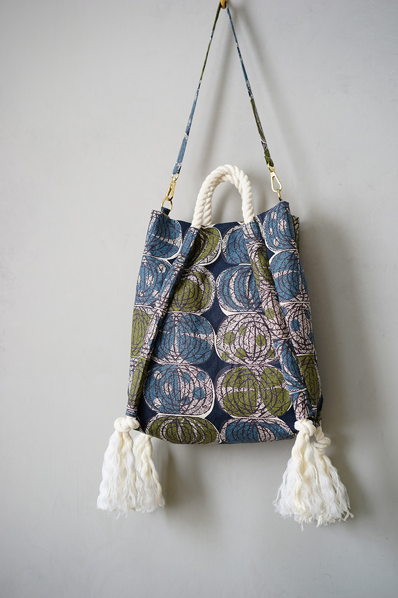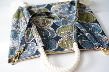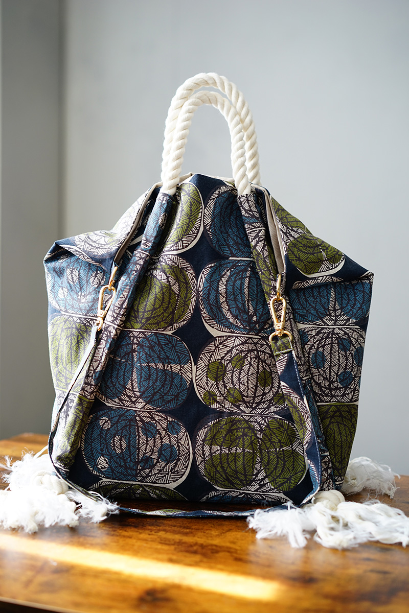 This convenient two-way bag can be carried by hand or over the shoulder. The African inspired fabric is matched with a natural unbleached rope. The fabric used for this bag is from the “African Fabric Style” series. Cotton linen sheeting is ideal for bag making.
