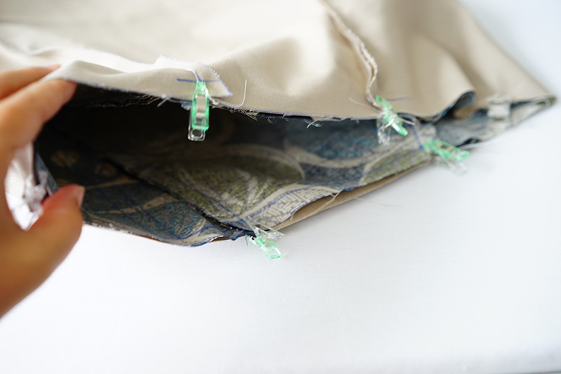 Baste the tab. With the front sides facing each other, put together the outer and lining bags and sew all the way around at the top.