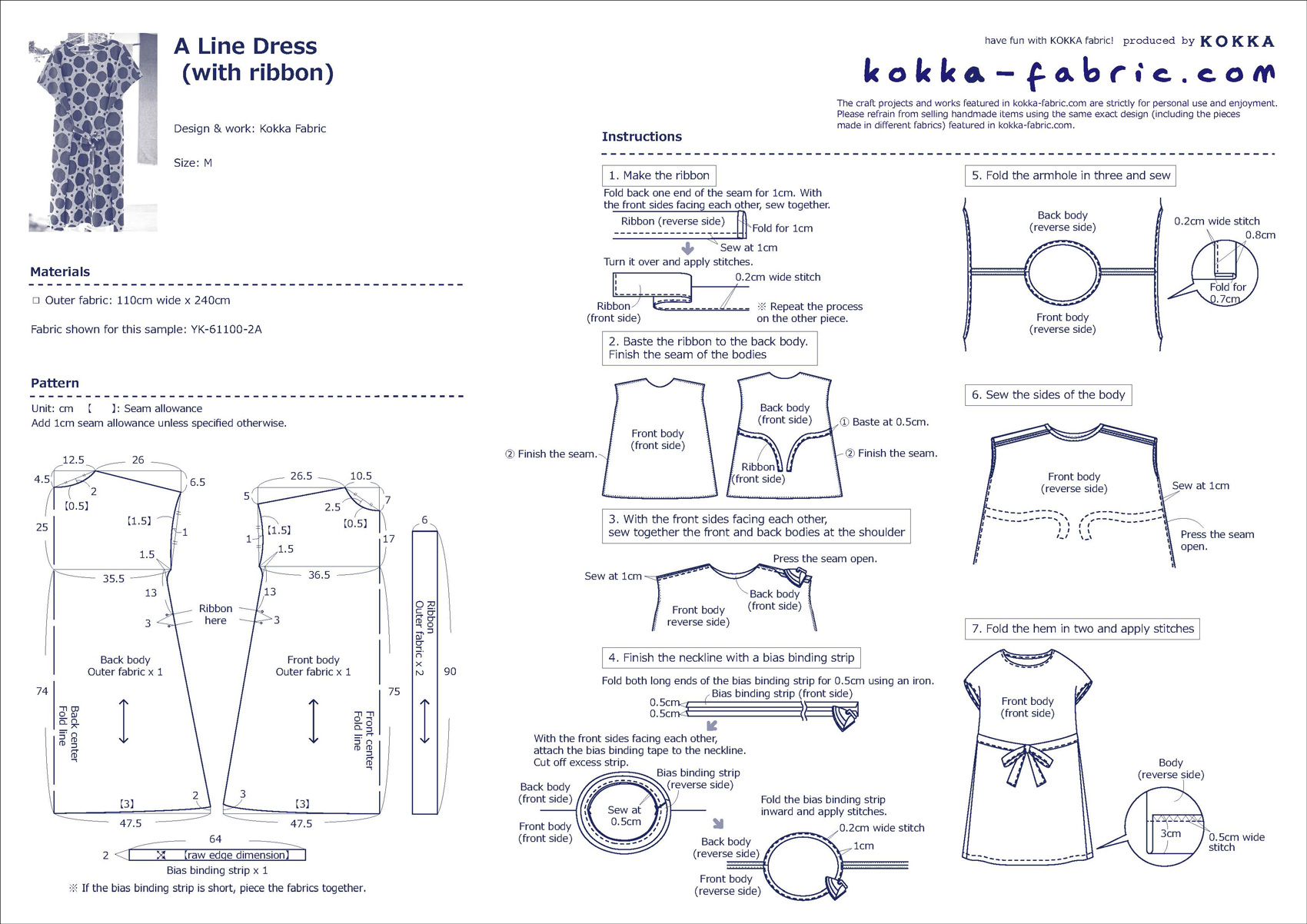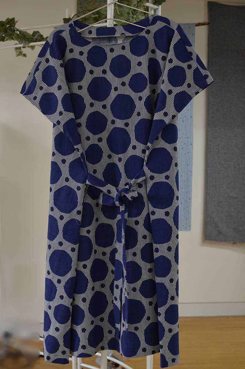 Featuring a beautiful silhouette, this A-line dress comes in a lightweight 100% cotton canvas fabric from the SIMPLE BLUE series. The pinstripe design with large and small dots looks quite impactful. The ribbon tied at the waist creates a slim and fit silhouette.