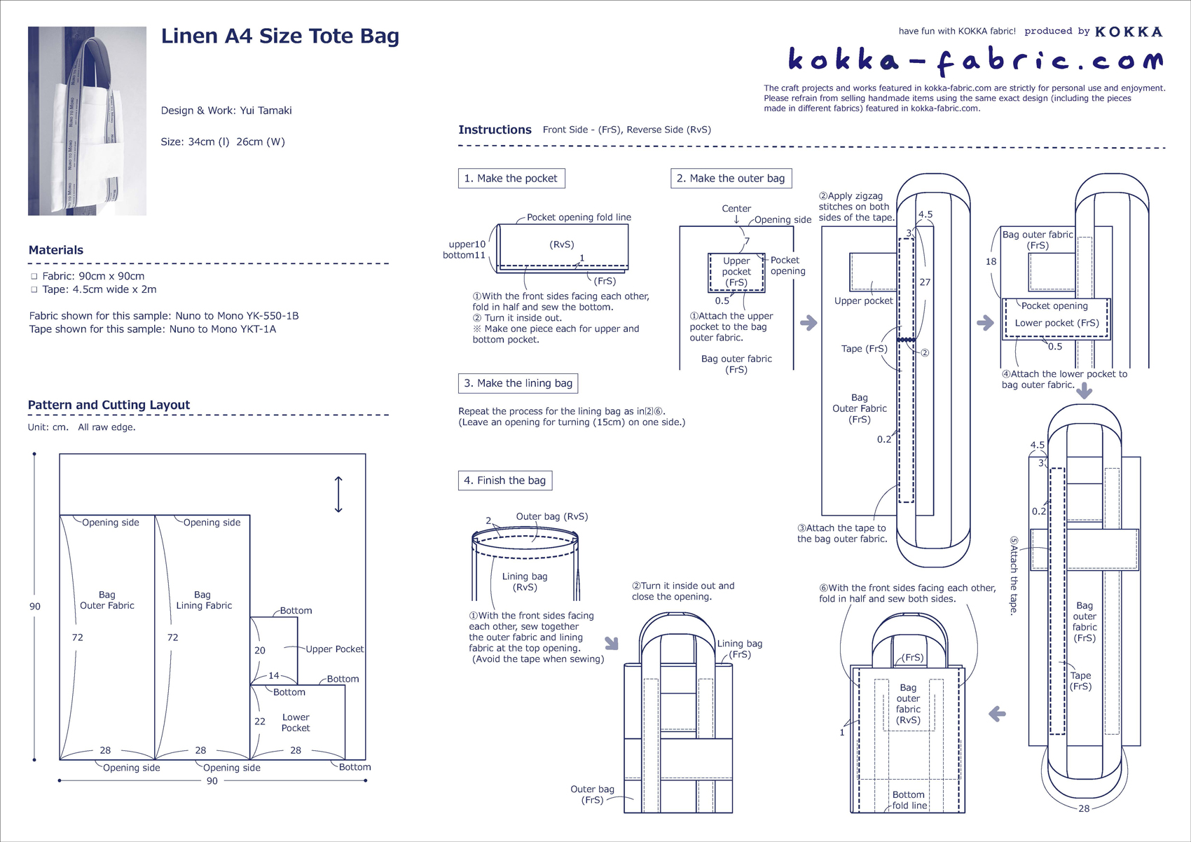 It is a smooth and elegant linen. The simple and stylish colors offer options for many uses. It’s a wonderful fabric to keep in stock. This time, I decided to make a flat A4 size bag as we have frequent exchange of documents during this new (fiscal) season (in Japan). Even after many washes and uses, it can still be a stylishly worn tote bag.