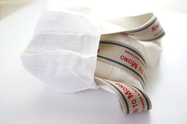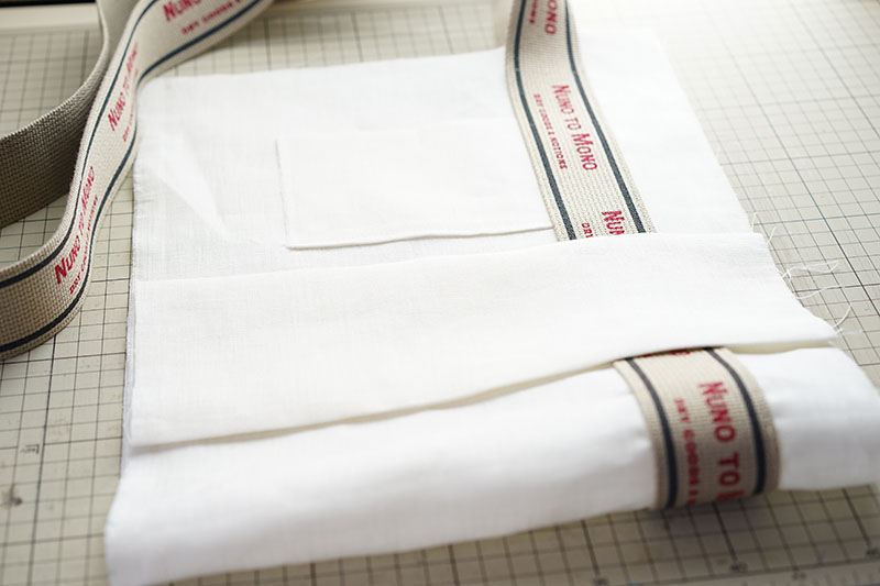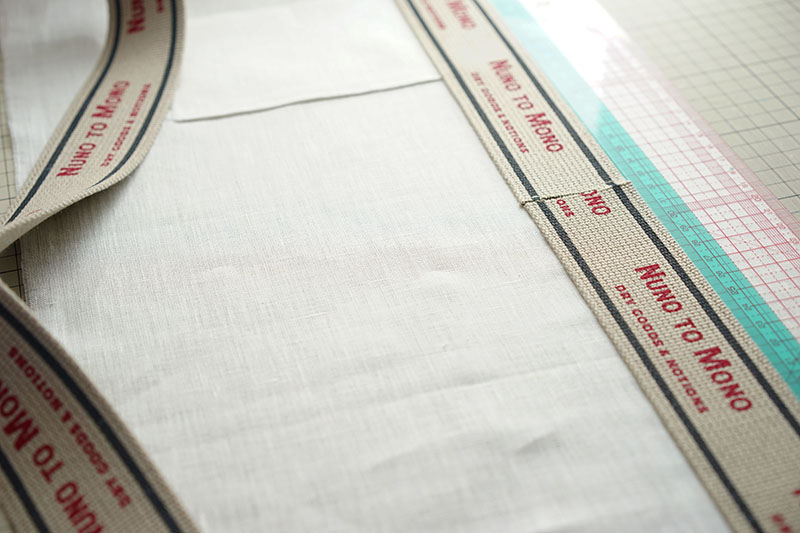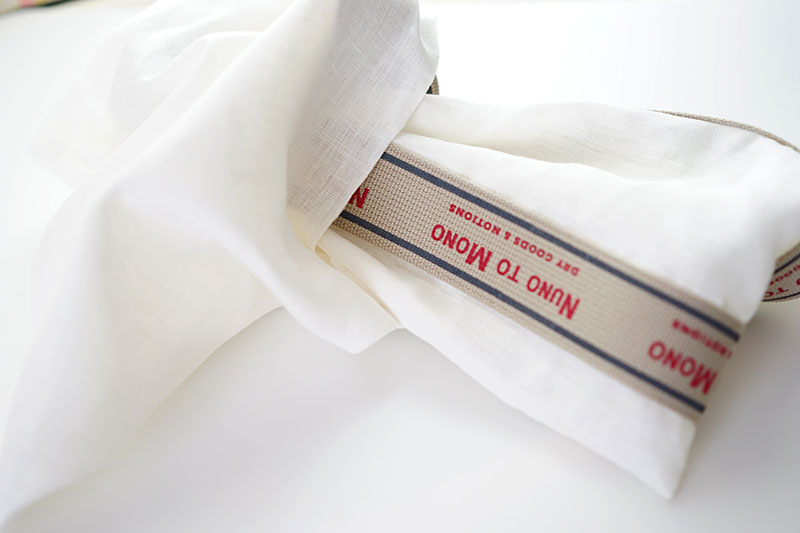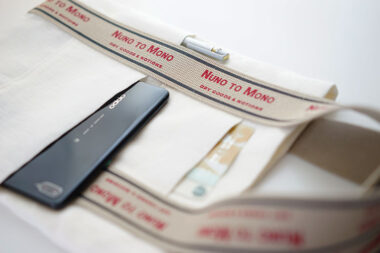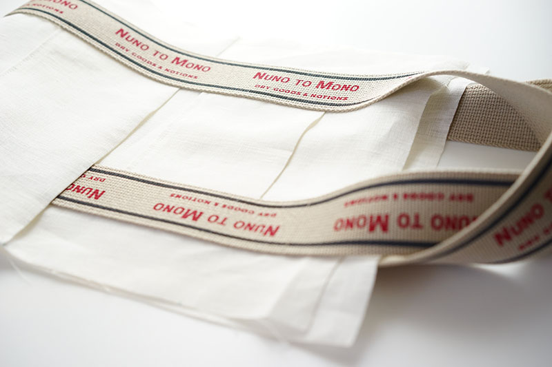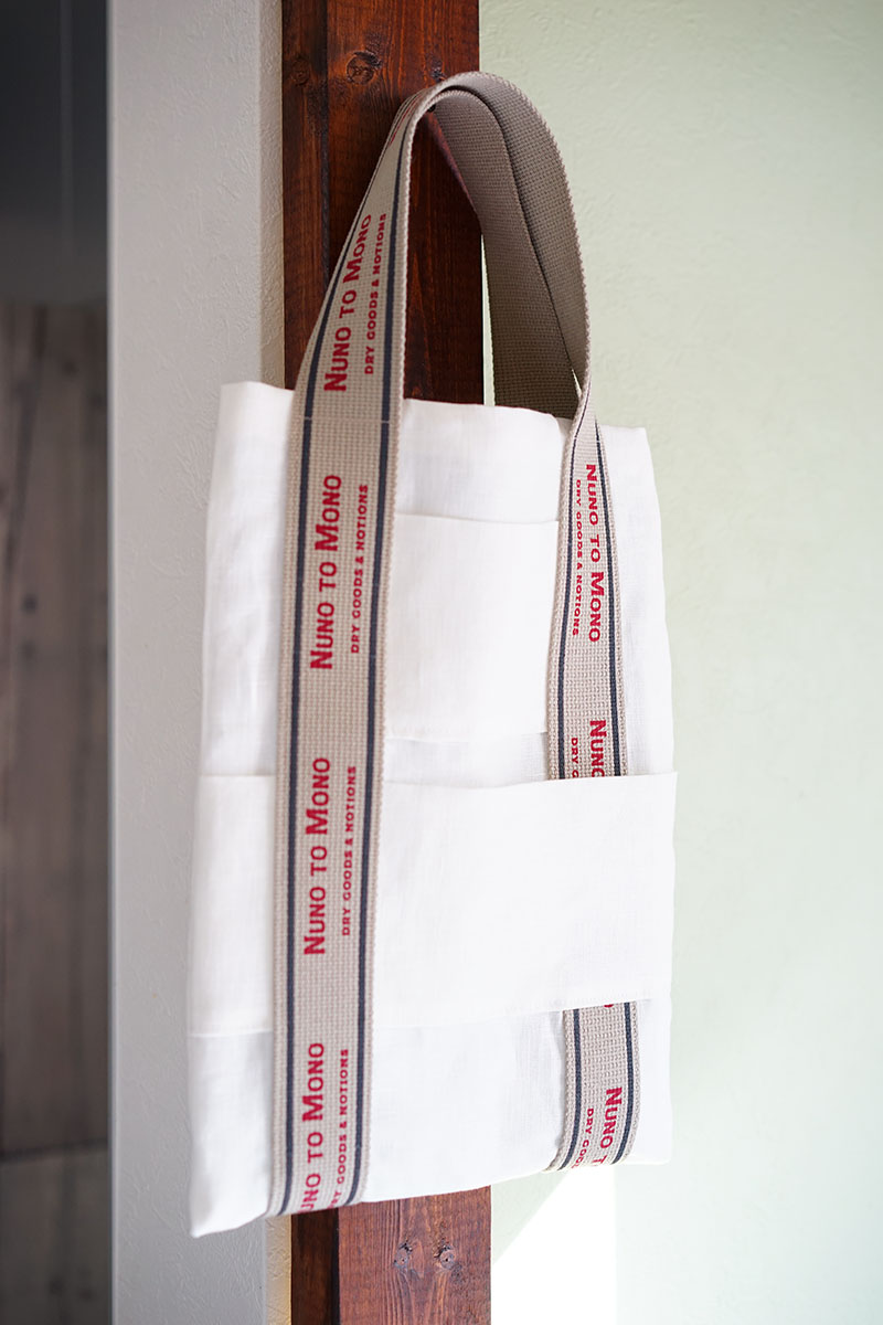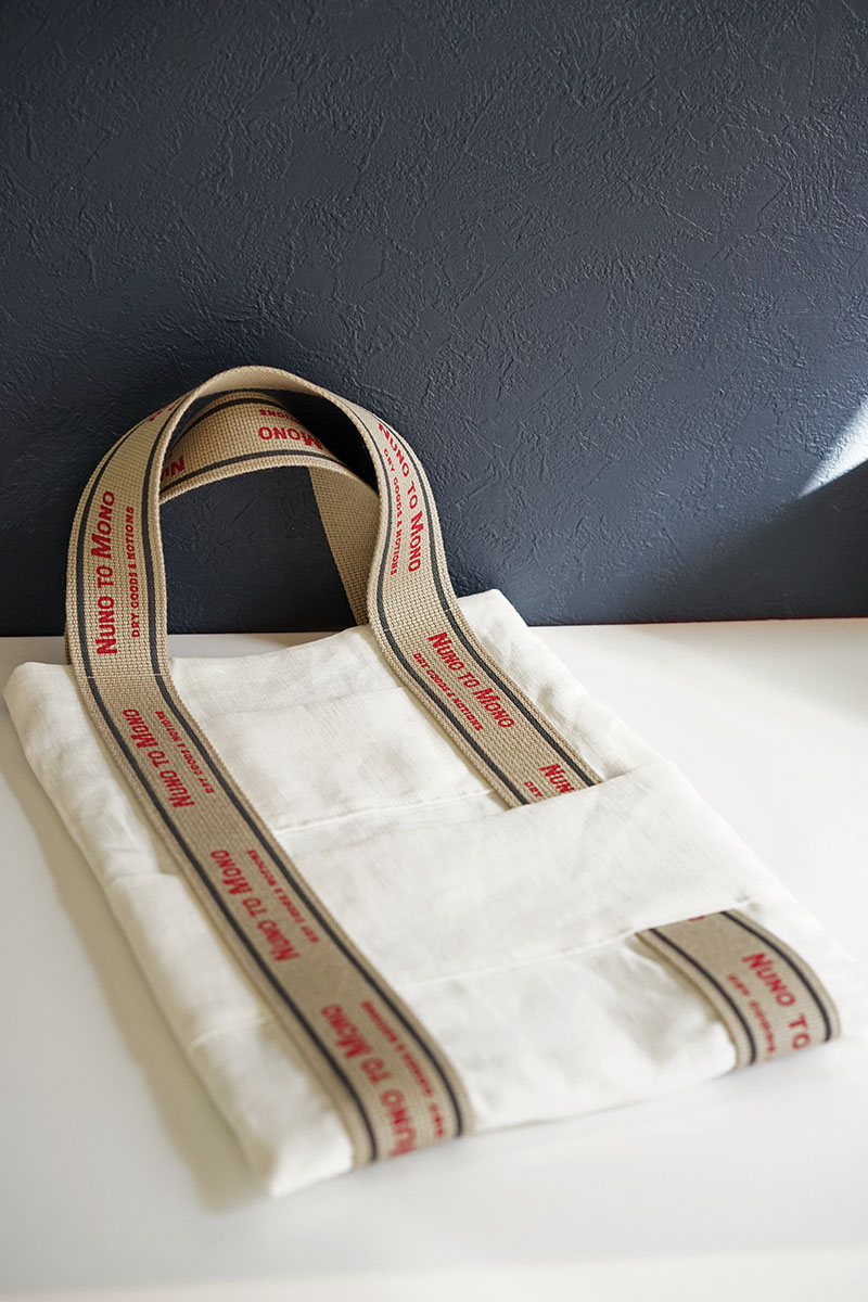 This tote bag can easily hold A4-size documents. The design is accented with a tape from the “NUNO TO MONO” series. It has a convenient outer pocket for cards and a smartphone. The fabric used is 100% linen, also from the “NUNO TO MONO” series. It is thin and easy to handle, and the more it is washed and used, the more it becomes soft and stylish with a worn look.