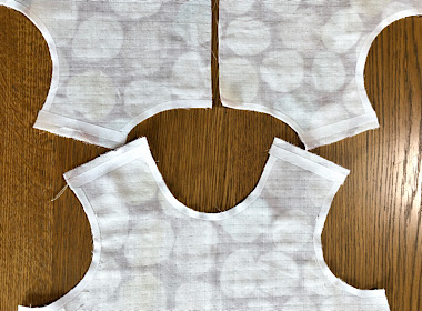 The picture shows the pieces with fusible interfacing. For the shoulder, it should be attached so that they hang over the seam allowance. For the sides and neckline, it should be attached so that they are on the inside of the bias.