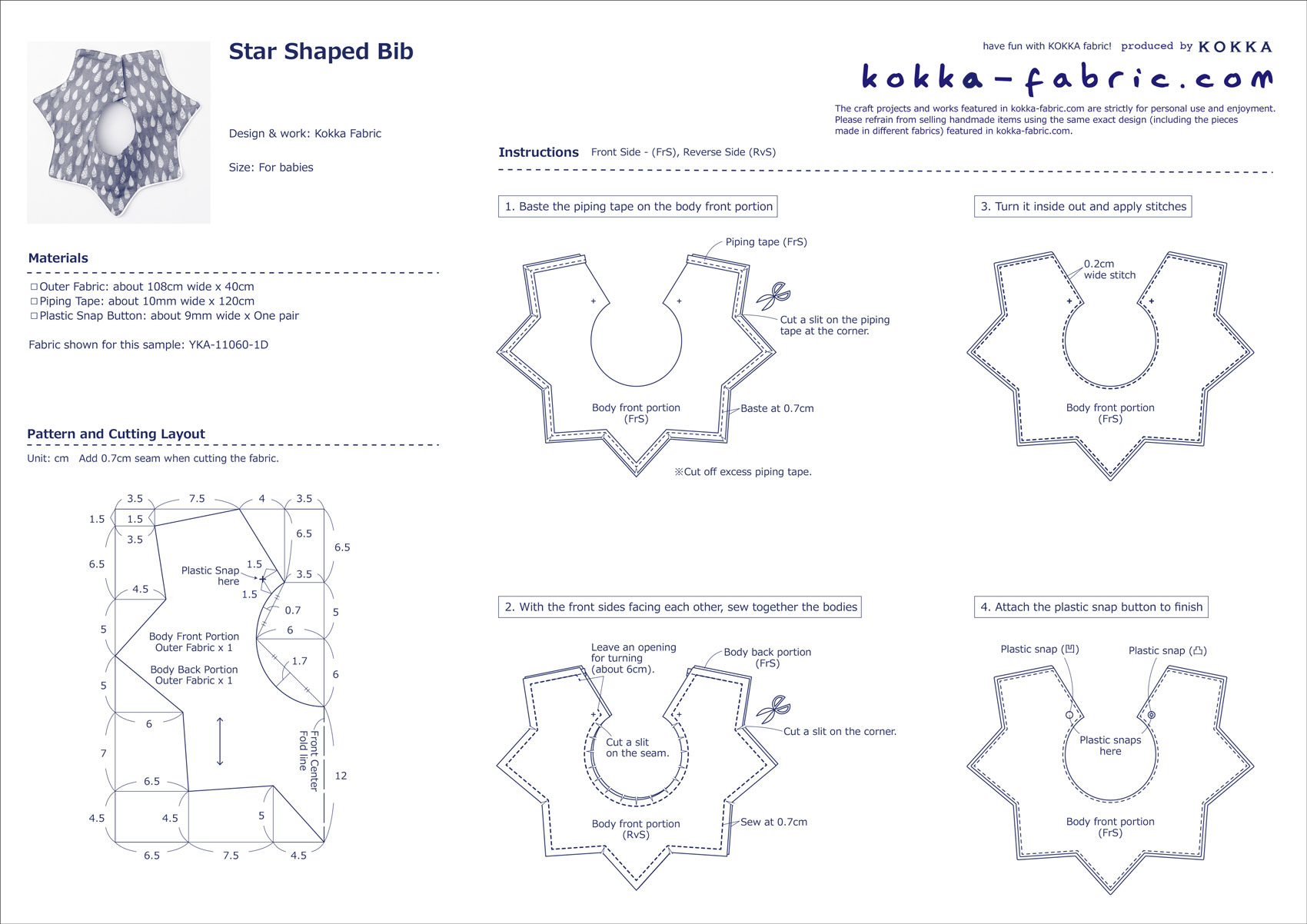 A lovely star shaped bib for your baby or a gift for your friend’s newborn. The fabric used for this bib is from the “Gifting Fabrics” series. This 100% cotton double gauze feels soft on the skin and is perfect for a baby’s clothing as well as a bib.