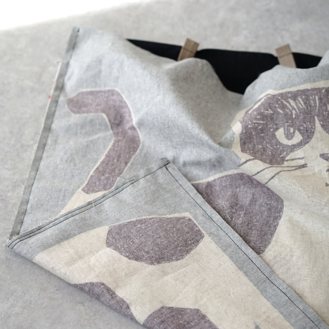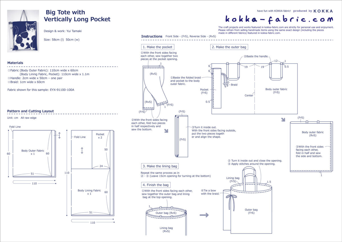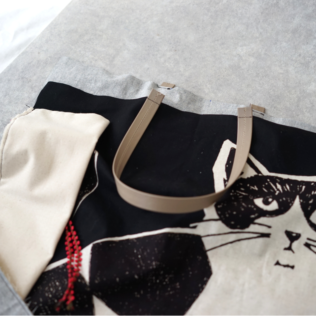 This roomy tote bag features an exterior pocket that easily holds long items like rolled-up posters or textile rolls. The fabric used for this bag is from echino's adorable NekoNoe series, showcasing a design of cute cats facing each other. Made from cotton-linen canvas, it is easy to sew and perfect for bag-making. This fabric also looks lovely as a wall tapestry, taking advantage of the large pattern.