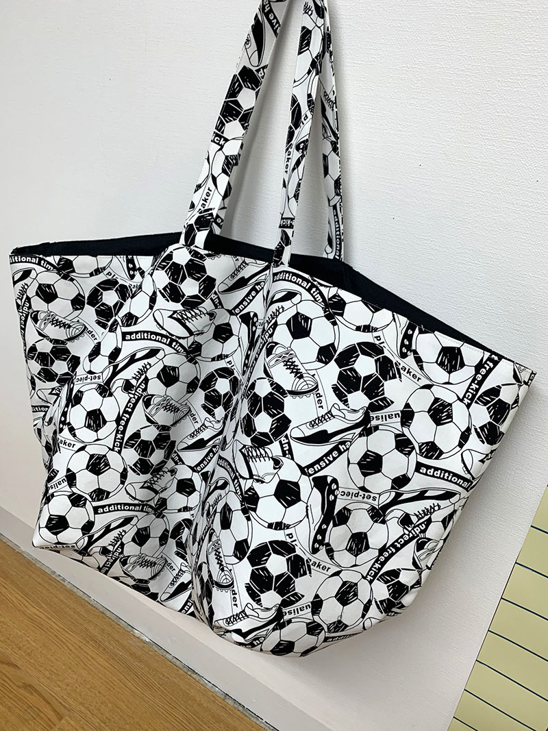 A handy item for everyday use, it is nice to have tote bags in a variety of sizes. With an ample gusset, this large bag can carry plenty of items. The MONO SPORTS series of fabric features an overall design of soccer balls that fits perfectly as a gym bag. The cotton 100% Oxford material is easy to sew and suitable for sewing beginners.