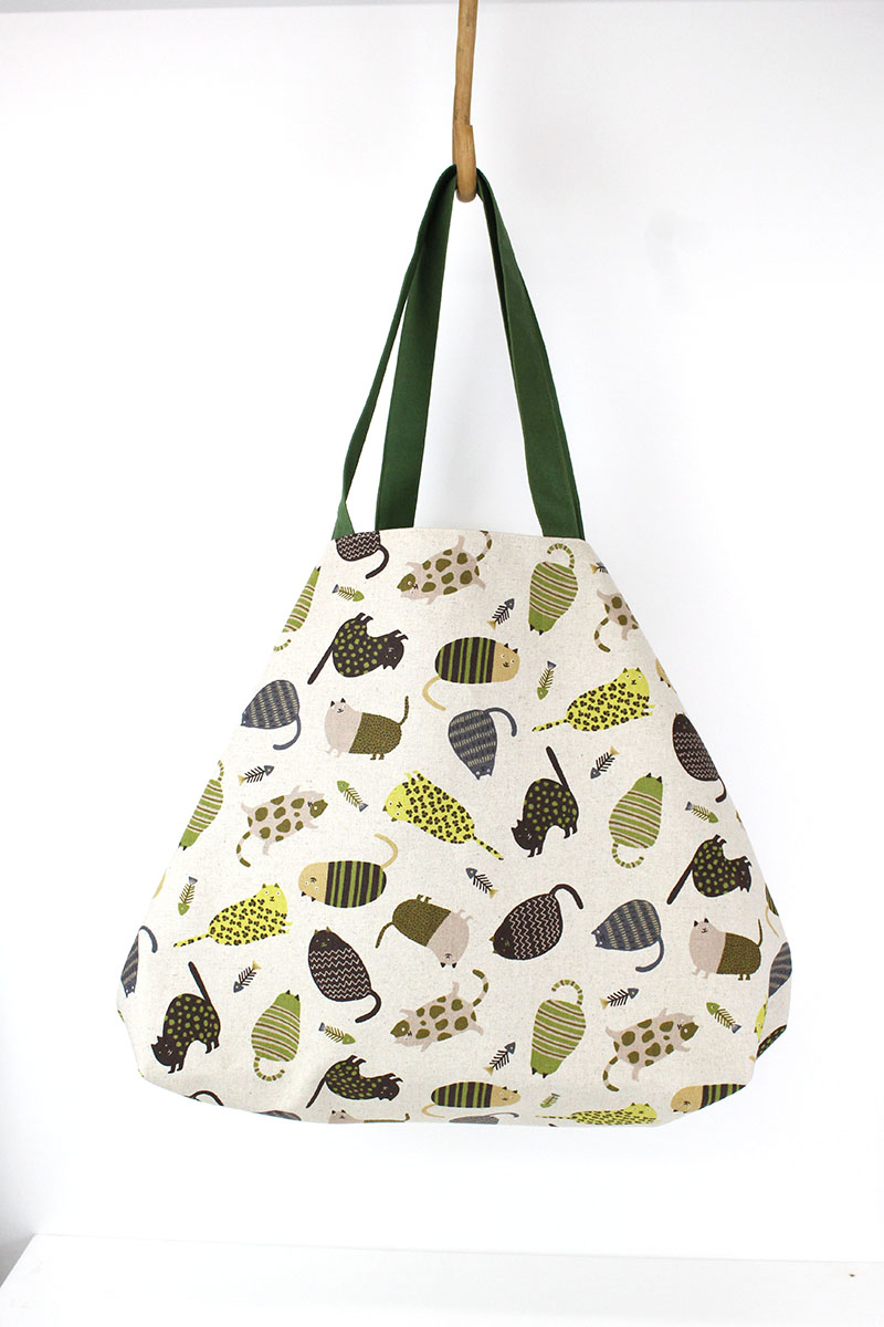A large bag that can fit a lot of items is perfect as a reusable bag for shopping. When you don’t have much to carry, you can fold the corners inward to make it compact, as shown in the photo. The featured fabric is from the “Patternful Animal” series. The animals with humorous expressions are so fun to look at. The solid cotton linen canvas is perfect for making bags.