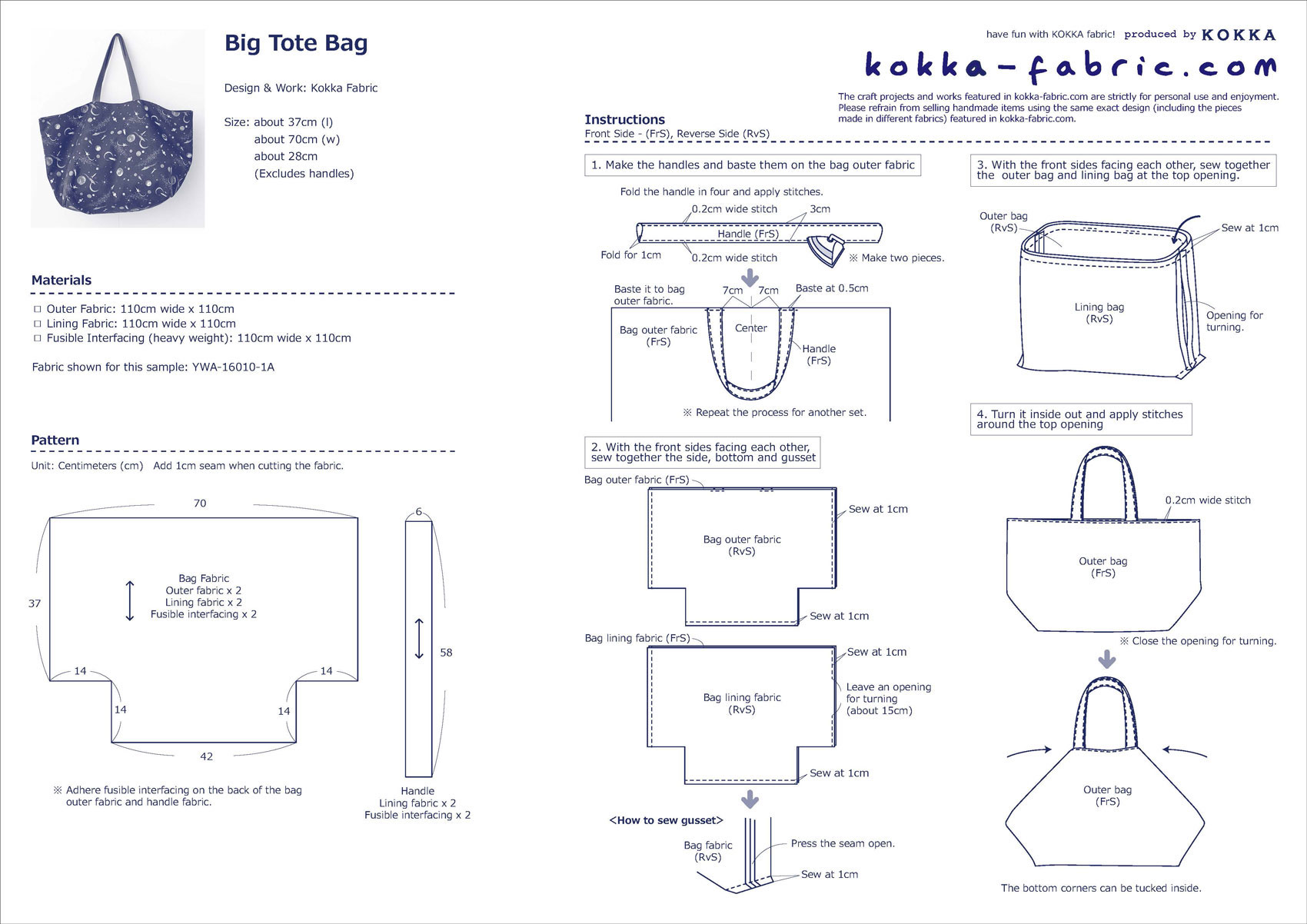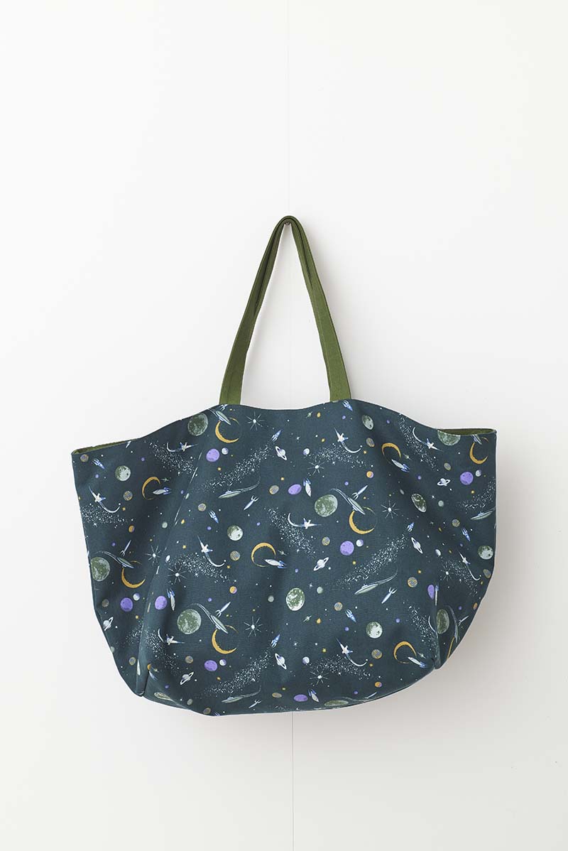 This large tote bag can hold many items thanks to its wide gusset. It is also convenient as an extra bag for your big shopping day. When you don’t have much to carry, you can fold the corners inward to make it compact. The space patterned fabric is from the “RETRO FUTURISM” series. The cotton linen canvas is perfect for making bags.