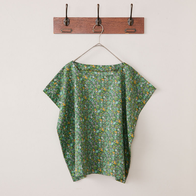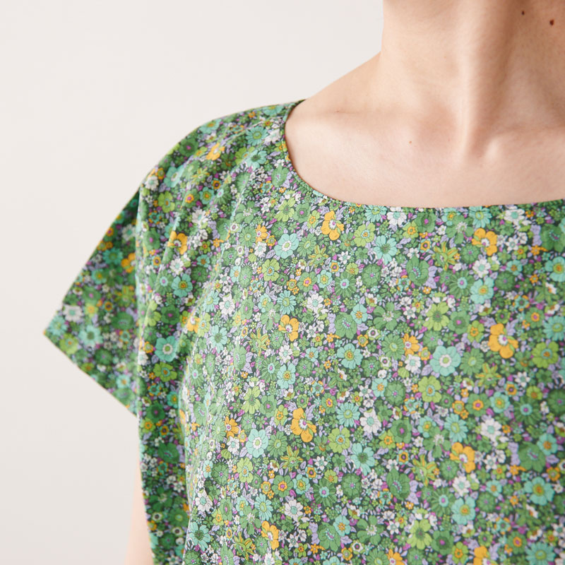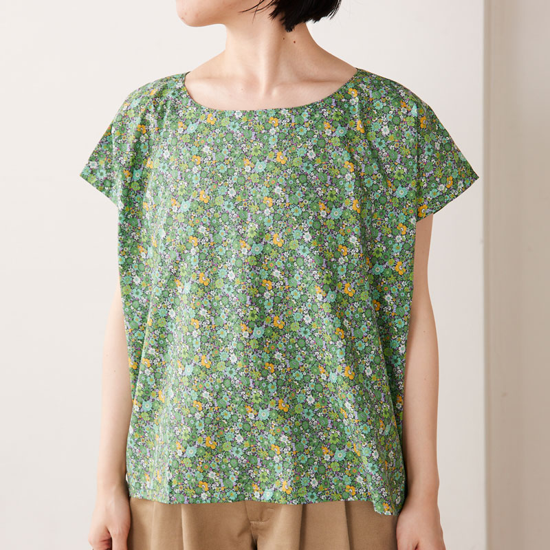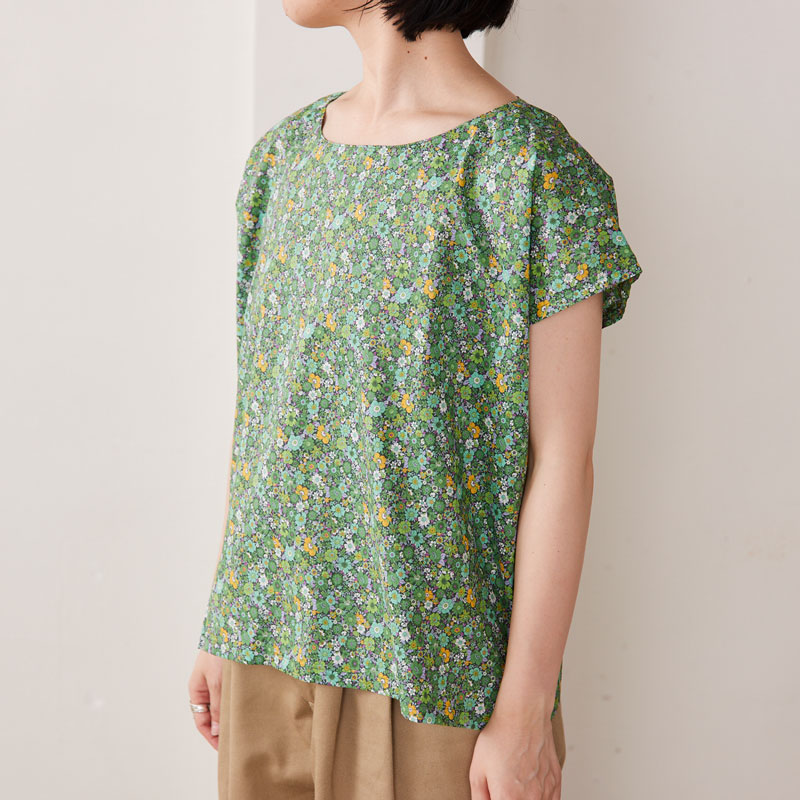 With capped sleeves, this blouse creates a sleek look for your arms. The curved neckline has just the right amount of opening to show off your collarbone. The fabric used for this blouse is from the “Flownny” series. The tiny floral pattern is perfect for the blouse. The 100% cotton lawn fabric is thin and silky, yet not see-through, allowing you to wear it lightly on its own.