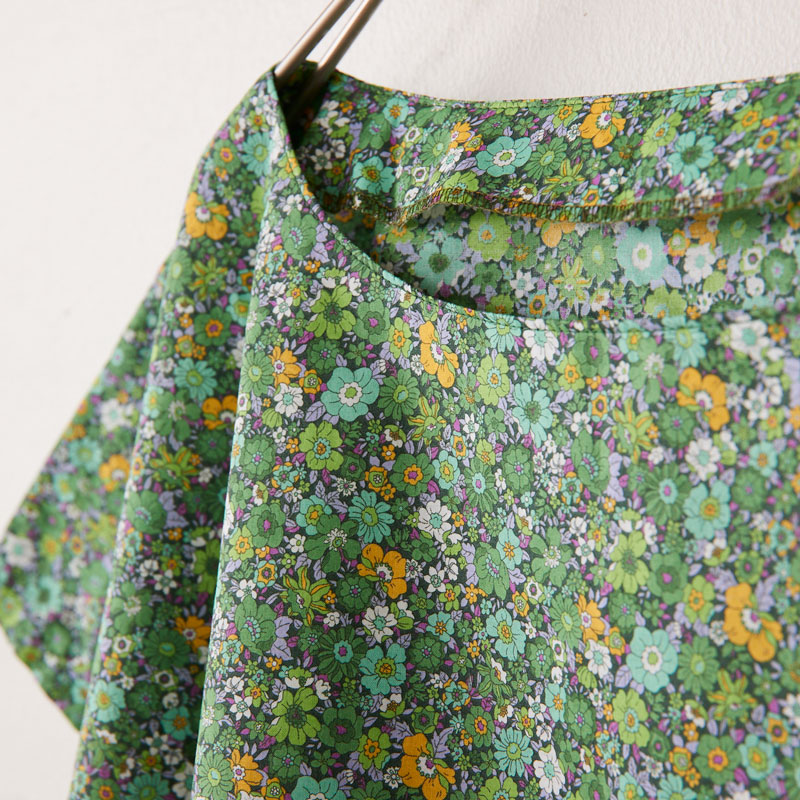 With capped sleeves, this blouse creates a sleek look for your arms. The curved neckline has just the right amount of opening to show off your collarbone. The fabric used for this blouse is from the “Flownny” series. The tiny floral pattern is perfect for the blouse. The 100% cotton lawn fabric is thin and silky, yet not see-through, allowing you to wear it lightly on its own.