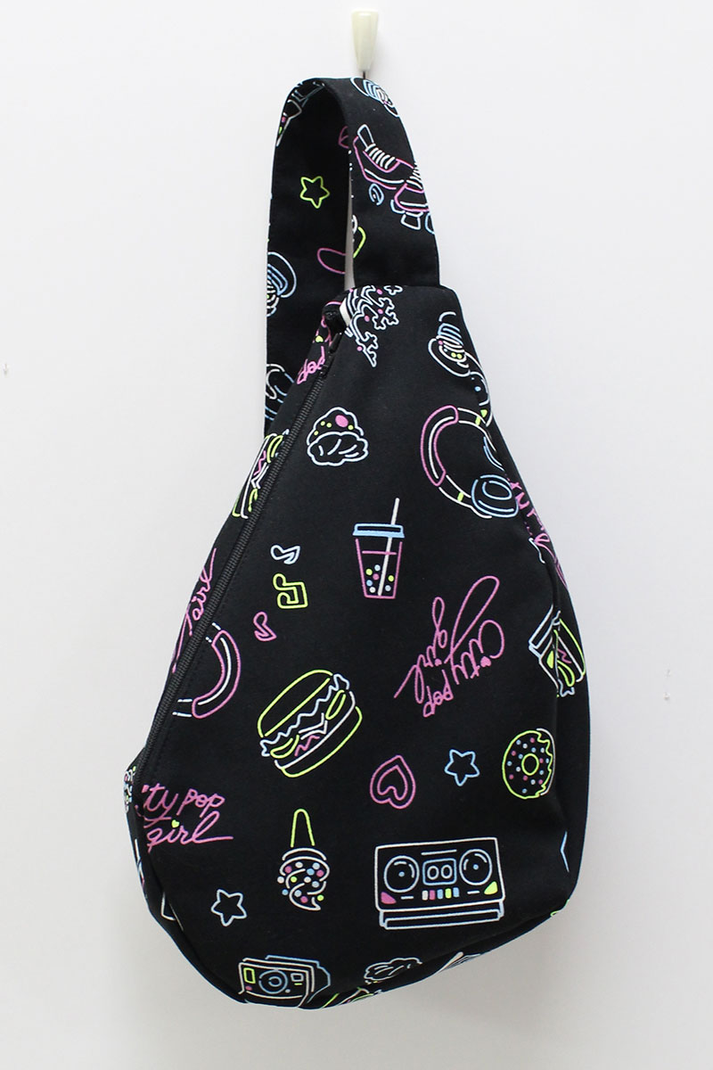 The body bag is convenient to carry a wallet and smart phone, essential items to accompany when going out. It fits nicely to your body and frees up your hands, an attractive element of this bag. The featured fabric is from the city pop girl series. The fun and pop graphic is like a crayon scratch drawing and the colorful tones appear over the black background. 100% cotton sheeting.