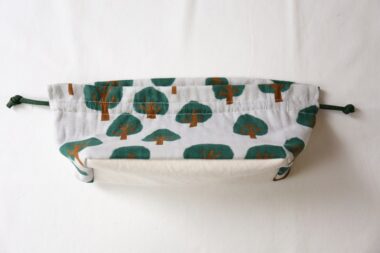 The part where you touch is made of double gauze for softness, and the bottom uses canvas for a solid finish, so it looks soft but holds its shape well. For this drawstring case, the accent is a tied bow of a solid dark green cord.