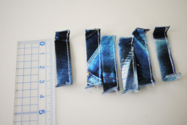 Fold the handle in half to make a long piece (with the front sides facing each other). Sew the long end at 1cm from the edge and turn it inside out.