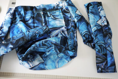 It has a unique design with a layered jeans motif, and the print is very realistic. While I thought that even a small item in this fabric will definitely stand out, I came up with a large bag so that the printed jeans design can be fully enjoyed.