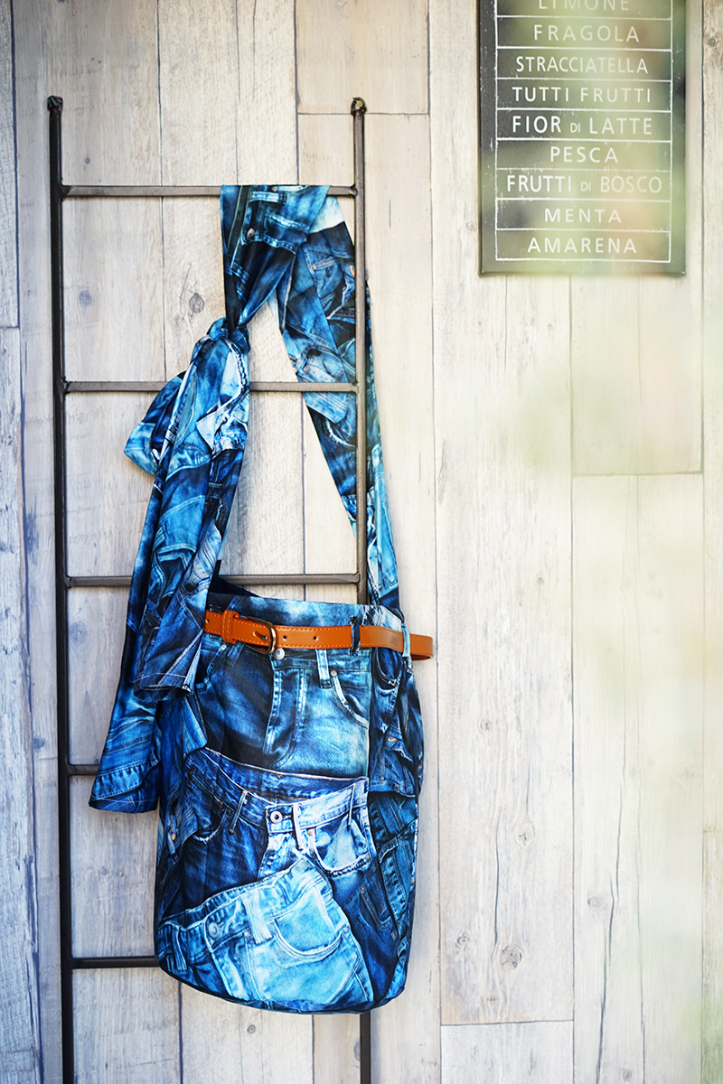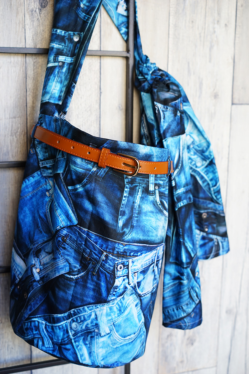 With a belt around it, this large bucket bag really looks like a pair of jeans. The length of the tied-handle is adjustable. The realistic print of the layered jeans is from the Ink Jet Series. It will be fun to make a matching tissue case and pouches.