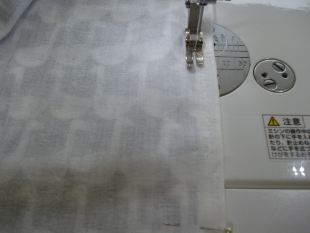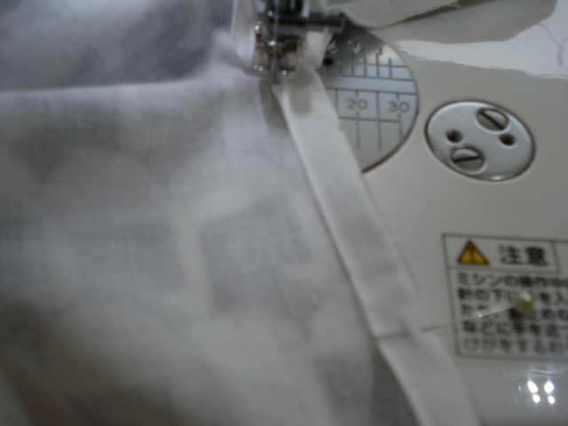 Fold* the 5cm-wide (120cm side length) white linen strip, and sew it with the reverse side of the front and back body. Leaving 20-22 cm (depending on the size of a person) of the strip unsewn, sew together the back body. This unsewn portion will be the strap. As if you were wrapping around the seam of the front and back body, fold the strap with front/outer sides facing outside and sew.