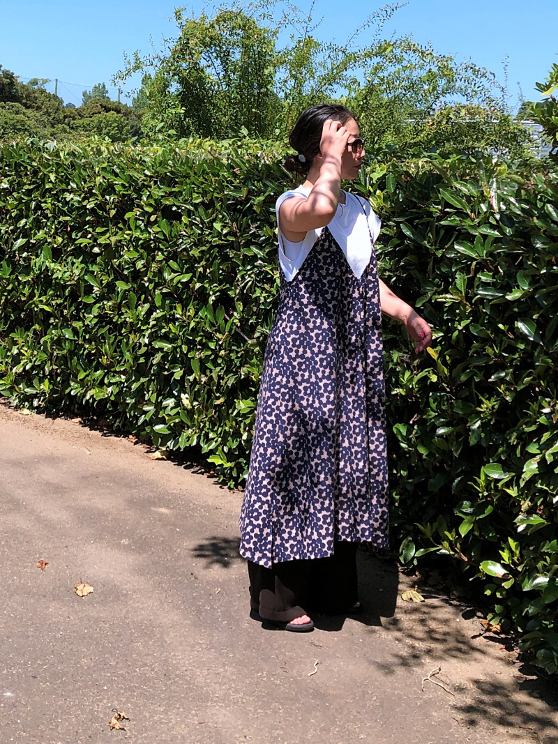 echino’s cotton linen sheeting fabric, bubble is turned into a camisole dress. Comprised of a series of bubbles design all throughout the fabric, you don’t have to worry about matching the patterns when cutting the fabric. The dress can be enjoyed in every season by combining it with different tops and bottoms. For summer with a T-shirt underneath, and for fall with a knit top and a pair of boots.
