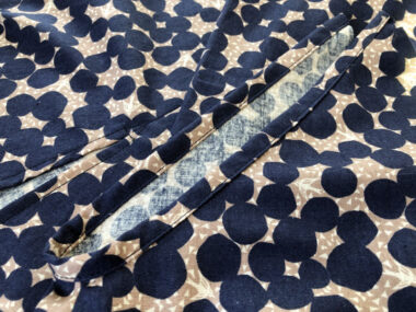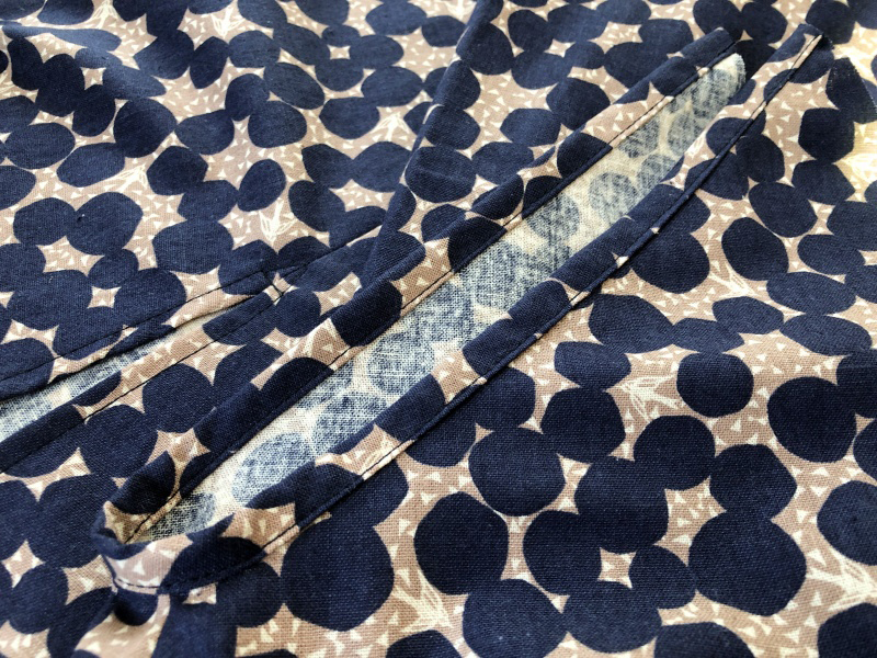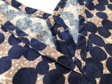 t requires a lot of process using the bias binding tapes. If you are not good at it, try to attach the front side with a sewing machine and finish it with blind hand stitching on the other side. If you are familiar with the process, you can cut the center fabric as one piece with a fold line and finish the V-shaped front.