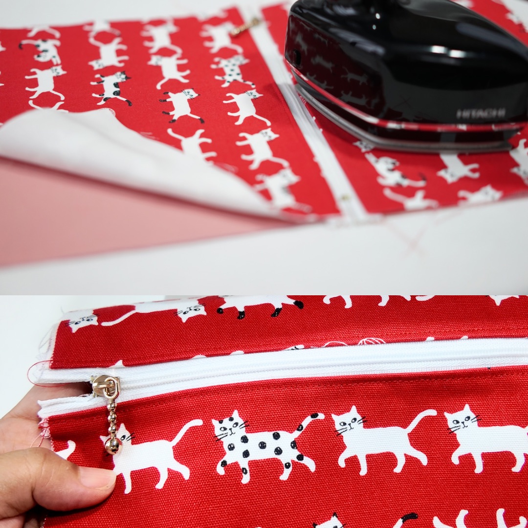 Align the seam and press with an iron. Apply stitches at 0.2cm from where the zipper is attached.