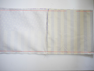With front/outer sides facing each other, put together the main bag fabric and lining bag fabric. Sew both edges. (1cm seam allowance) (Leave the zipper open and leave an opening for turning on the lining bag side. Press down the seam to the lining bag side.)
