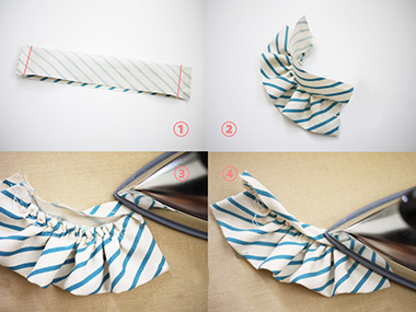 Turn the fabric inside out and sew the edge. Pull the thread to create gathering, making the total length of the fabric to about 10 to 11cm.