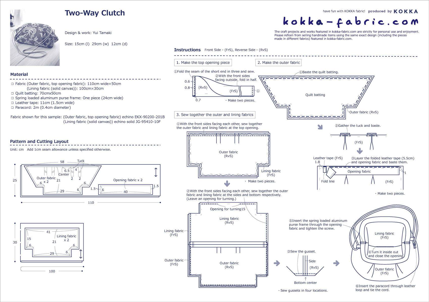 A lovely roundish-shaped little two-way clutch bag can also be carried with a strap as a shoulder bag. The Classic animal cotton linen fabric from echino’s standard series is a perfect fit for bag making. Despite its compact size, it can carry more items than you think. With a smart phone and wallet inside, it will definitely become handy as an everyday bag!