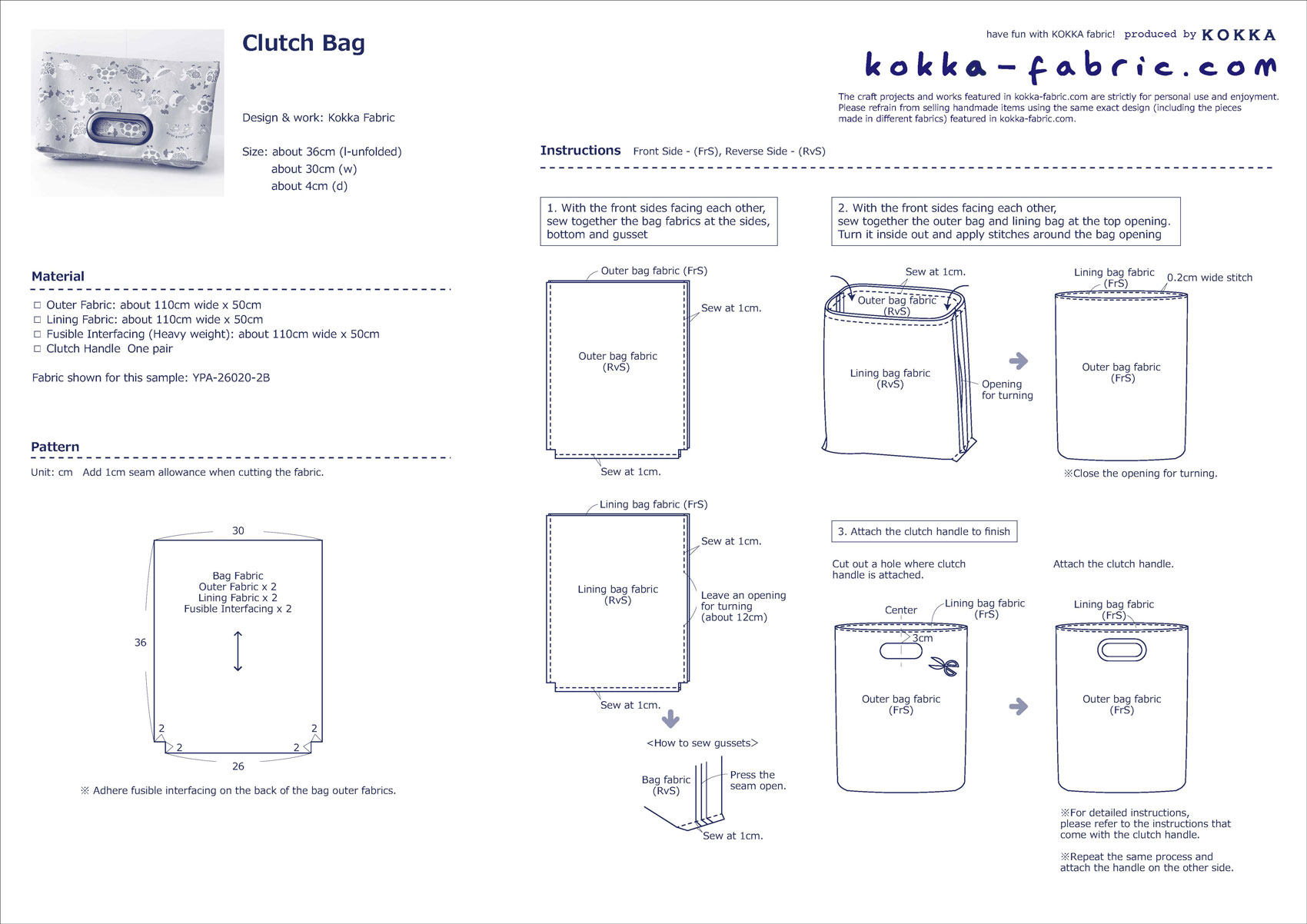 Making this clutch bag is as easy as piecing together fabrics into a bag with simple straight stitches. An effortless project even if you are new to operating a sewing machine. The clutch handle attached through a fabric cutout gives this bag a stylish look. This fabric with a lovely lined up chickens and chicks design is from the collage pattern series. It is a cotton 100% Oxford fabric.
