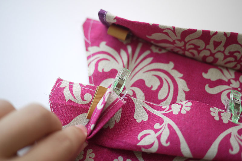 Turn it inside out and close the opening for turning. Insert the spring loaded aluminum purse frame through the opening fabric.