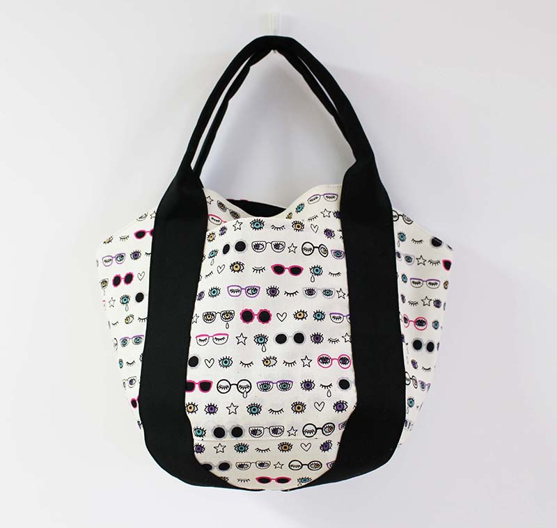 The round shape gives this tote bag extra cuteness. The charm of this bag are the handles that wrap around the bottom. The black solid handles bring an edge to adorable small patterns. The featured fabric is from the Hito+Mono+Parts series. Little motifs like eyes and glasses make this cotton 100% sheeting textile perfect for making pouches and small items.
