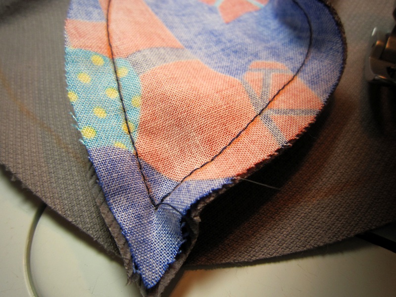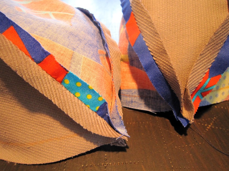With front/outer sides facing each other, sew together. Leave the top point portion of the seam allowance open. Only sew from one peak point to another. This helps the seam allowance from being pulled to tight.