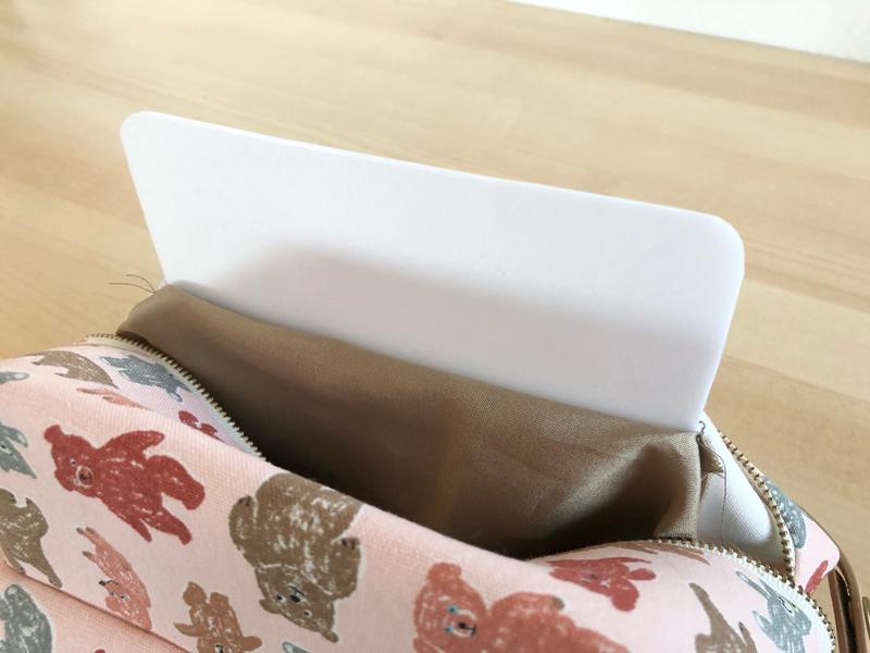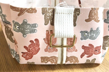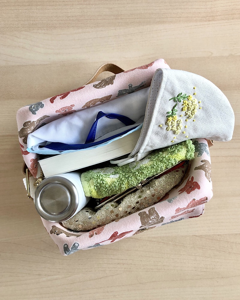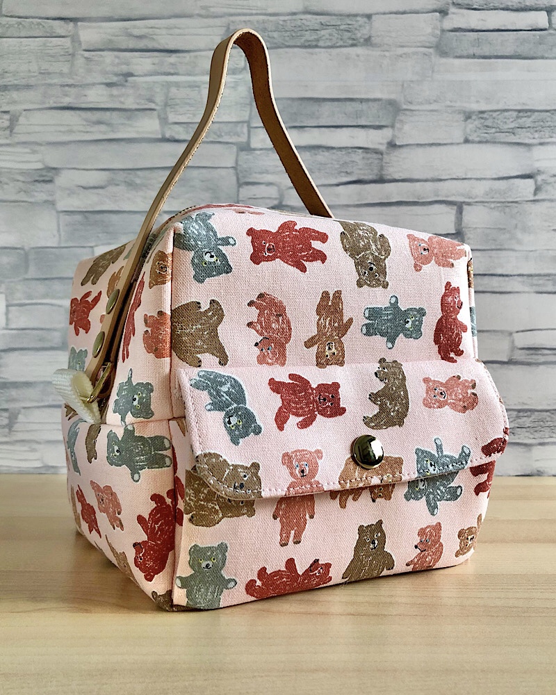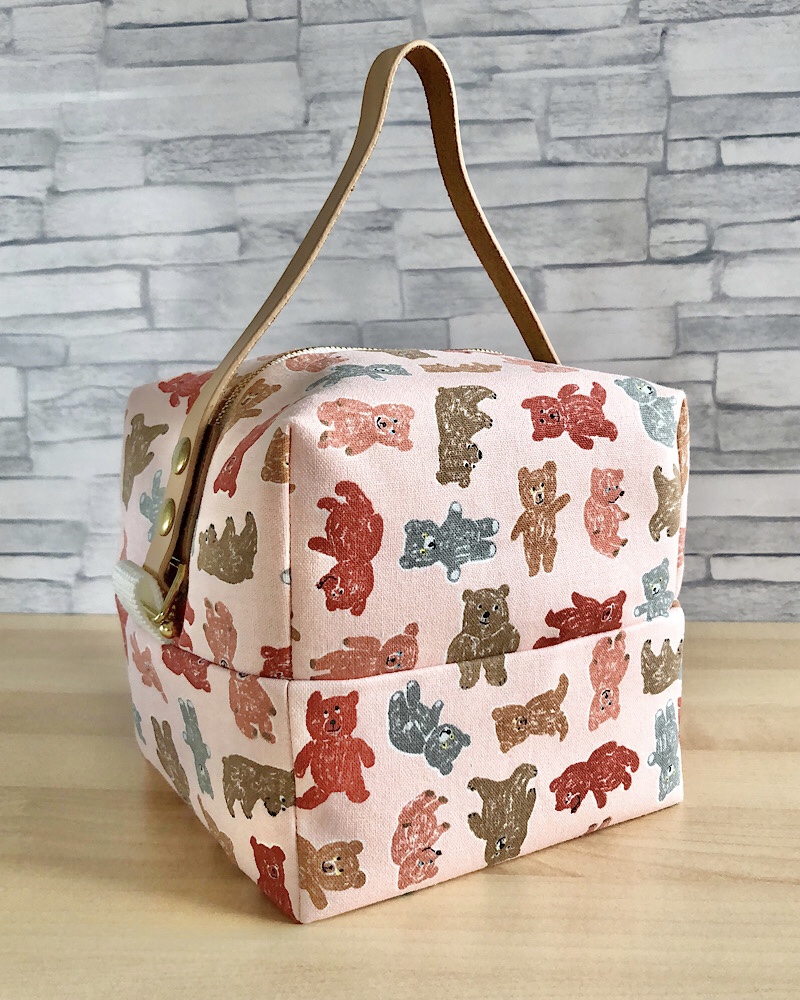 This is a dice-shaped bag with a cute, rounded form. The outer pocket with a gusset is perfect for holding your phone. The addition of a polyethylene core prevents the bag from losing its shape. The featured fabric is [Kuma Kuma] from the kotorinuno series. It is a cotton linen canvas with just the right thickness for making bags.