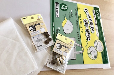 These are some of the materials used for the project. The hard core sheet, which can be sewn on a sewing machine, and a plastic snap, which can be easily attached by hand, are easy and convenient. Since the core sheet is inserted, a medium thickness fusible interfacing is selected.