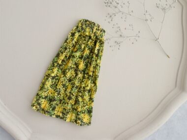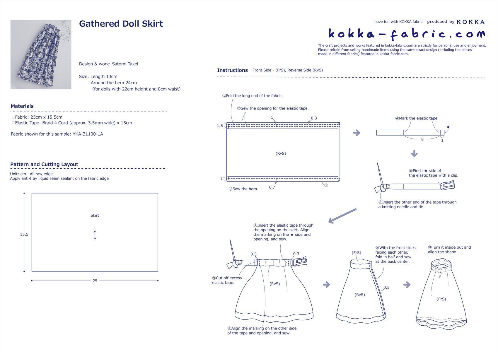 Interested in making a doll’s outfit? This gathered skirt with an elastic waist is a perfect piece for a sewing beginner. Made for a 22cm doll, the skirt features a thin fabric with a small pattern which works well for a doll’s clothing. The eye-catching beautiful colors are also ideal for a fun photo session with your favorite doll in a matching outfit.