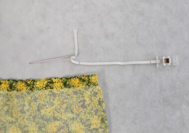 Attach a clip on the end of the elastic tape with a 1cm marking to hold the end. Insert the other end through a knitting needle and tie the end loosely.