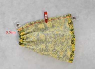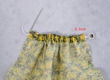 Make an opening for the elastic tape around the waist. Apply two stitches (one at 0.3cm from the top, and another at 0.7cm below the first stitch line (at 1cm from the top)). For the hem, apply stitches at 0.7cm from the bottom.