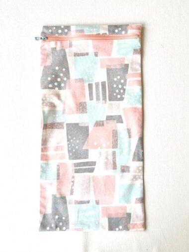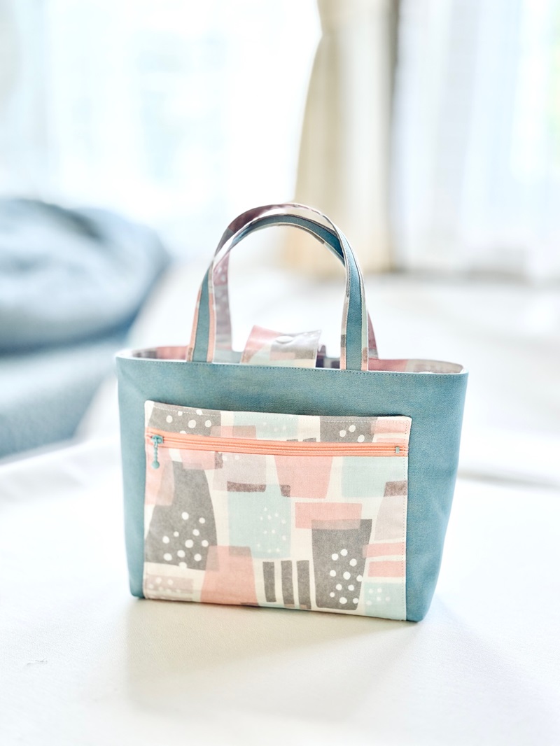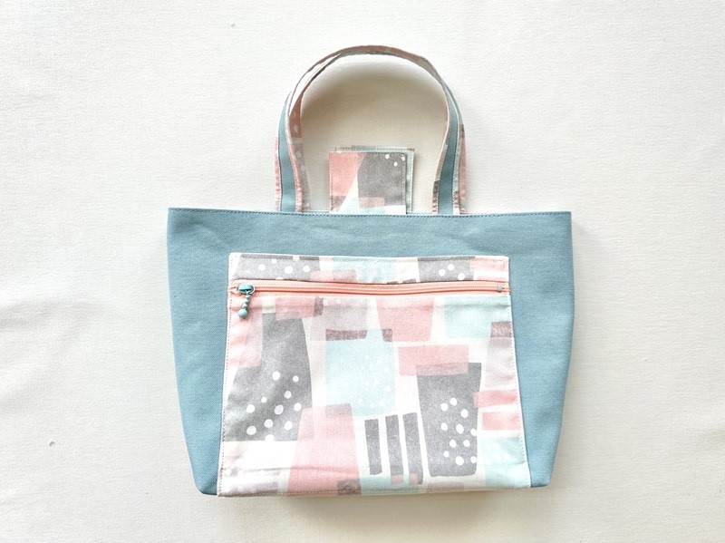 A convenient bag with double-sided pockets is featured. The fabric used for this bag is from the “POWER GIO” series. The random geometric pattern allows you to sew without worrying about the pattern’s orientation. The 100% cotton sheeting is easy to sew and perfect for sewing beginners.