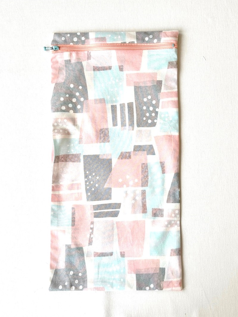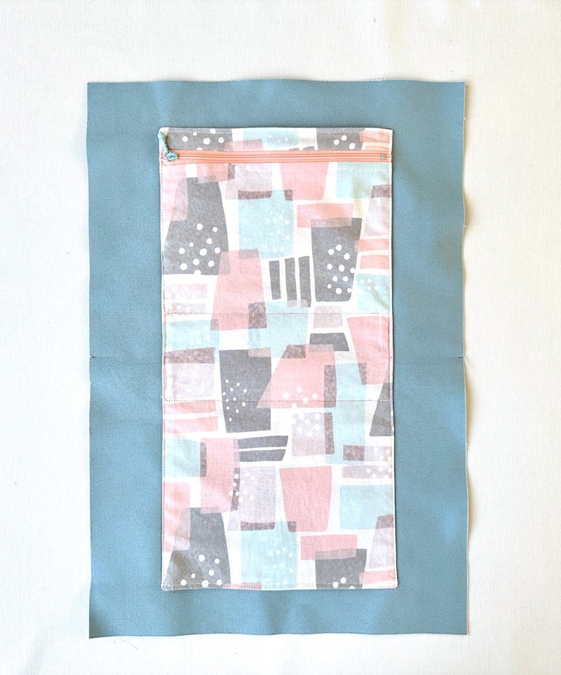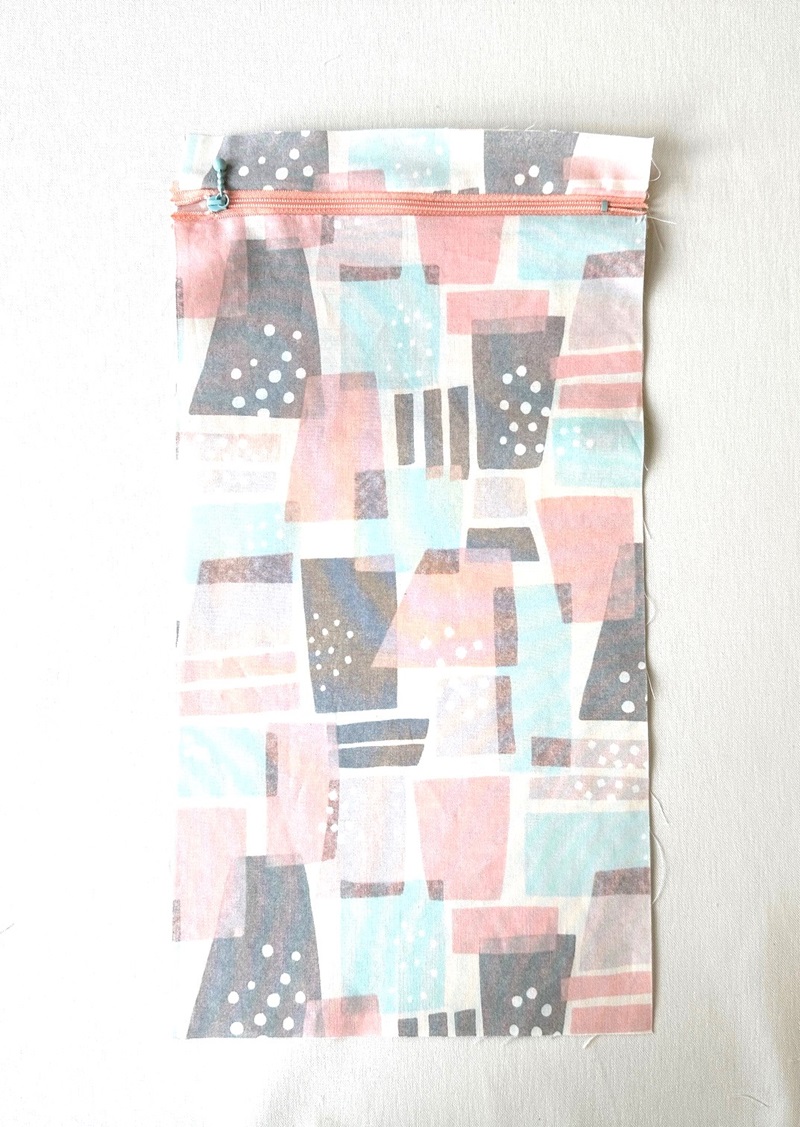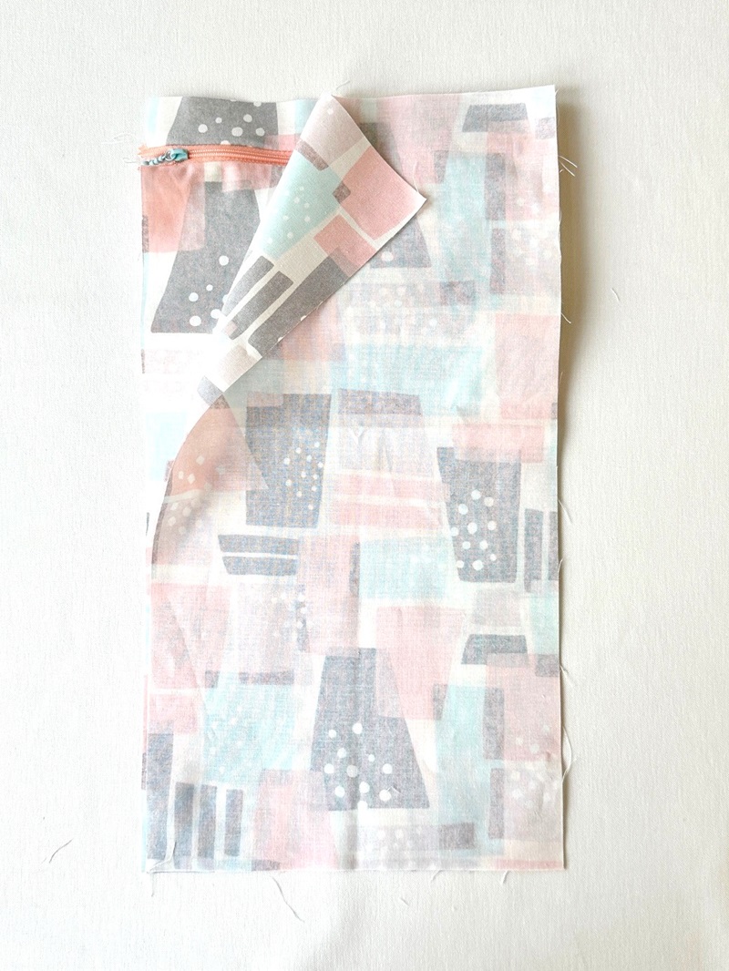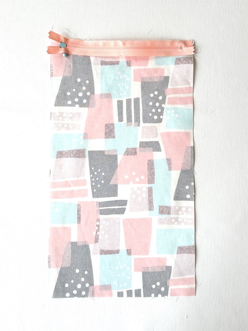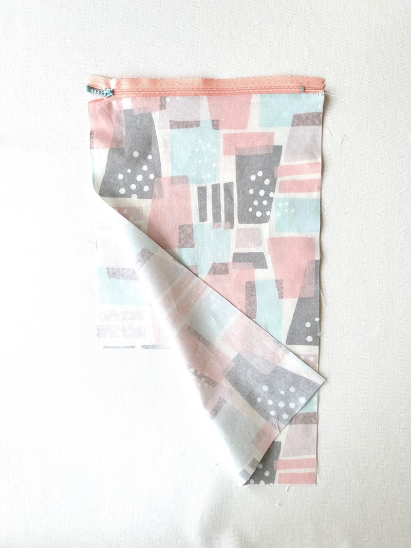 Open the piece from step 1. Fold the pocket lining fabric, baste it together with the other side of the zipper. With the front sides facing each other, sew together with the pocket top fabric.
