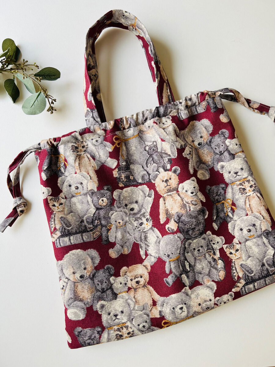 This is a cute drawstring tote bag tied with side ribbons. The fabric used for this bag is from the “UKIUKI WEEKEND” series. The design features distinctive pop-colored dots and drops, which are among girls’ favorite motifs. This 100% cotton sheeting is easy to sew and recommended for sewing beginners.