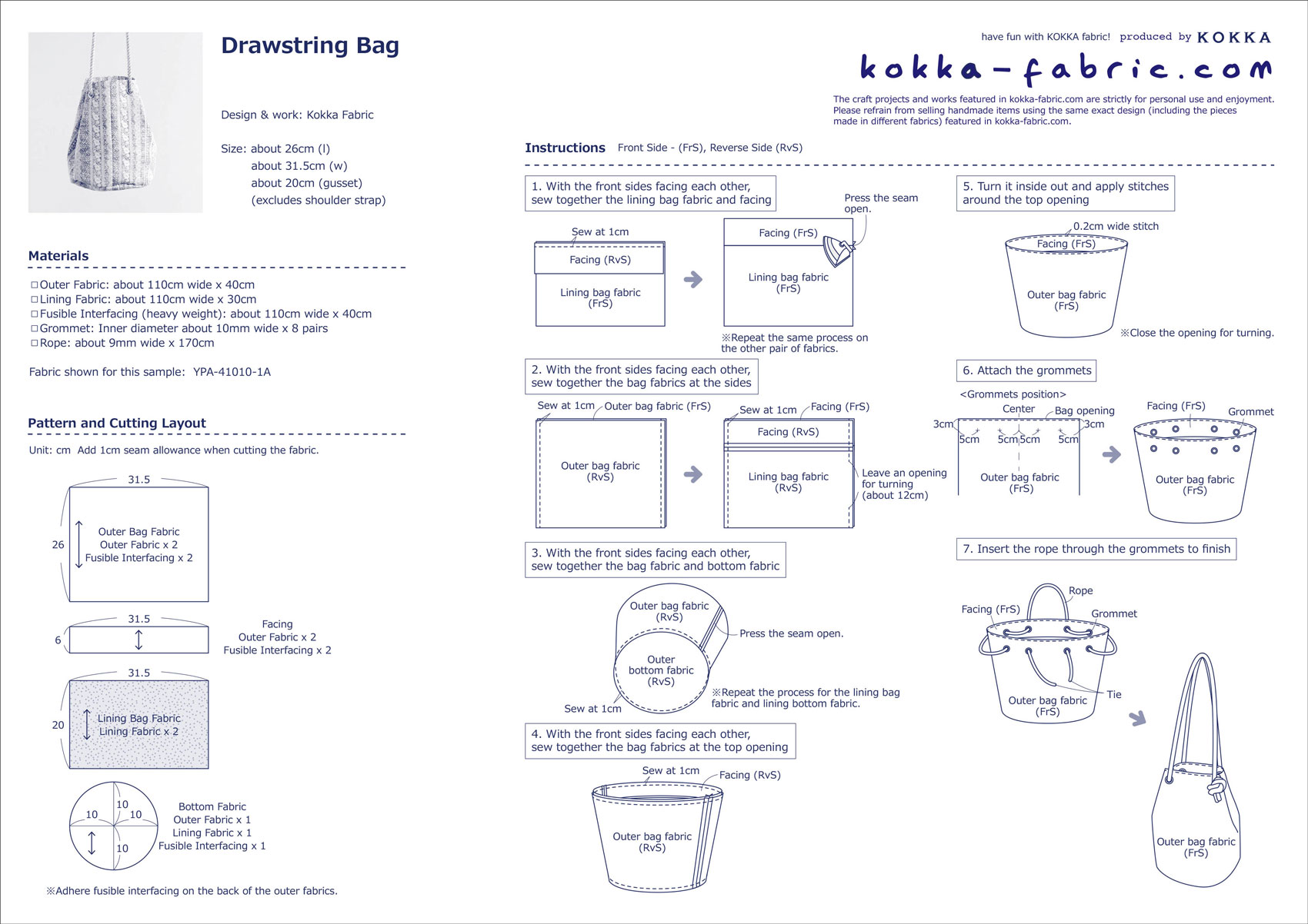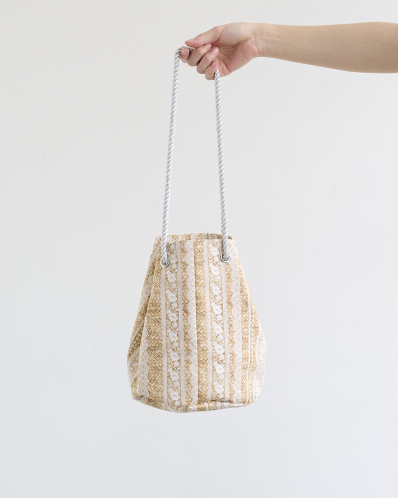 This is a round-bottomed drawstring bag. The shoulder straps are accented with grommets and rope. The fabric used for this bag is from the “Lace x Basket” series in the realistic lace print. Depending on how you cut the material, you can easily make a cute basket. This easy to sew 100% cotton oxford fabric is recommended for bag making and suitable for sewing beginners.