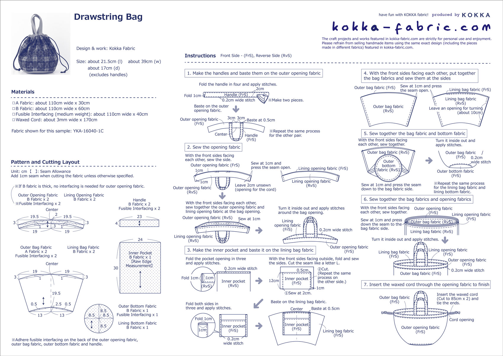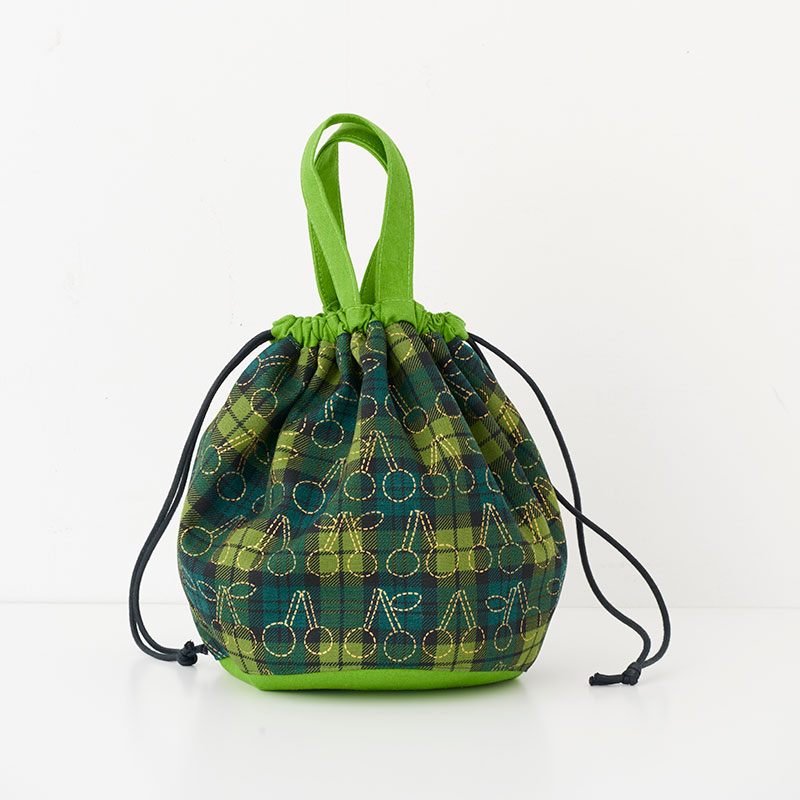 The handles make this simple drawstring bag convenient to carry around. Plus the round bottom provides ample room. The fabric used for this bag is from the “British” series. The stitched cherry design adds cuteness to a traditional checkered pattern. It is 100% cotton oxford, a suitable material for making bags.