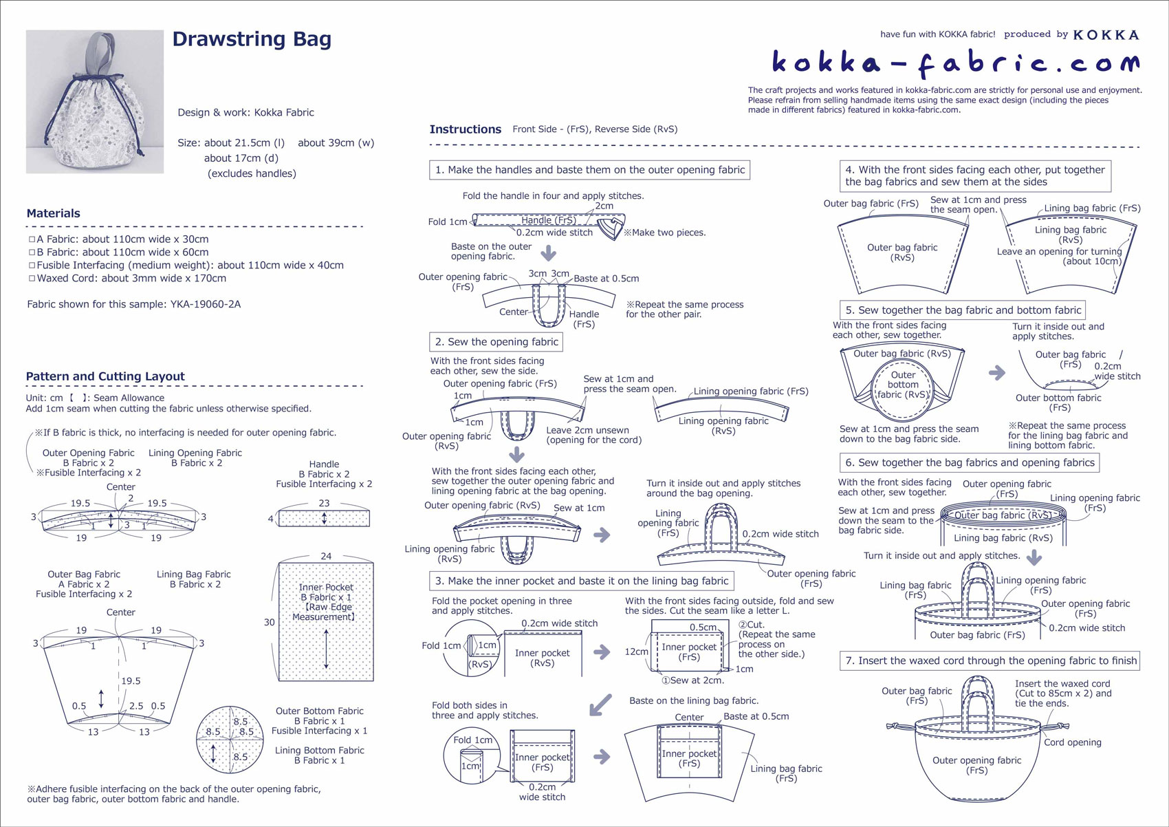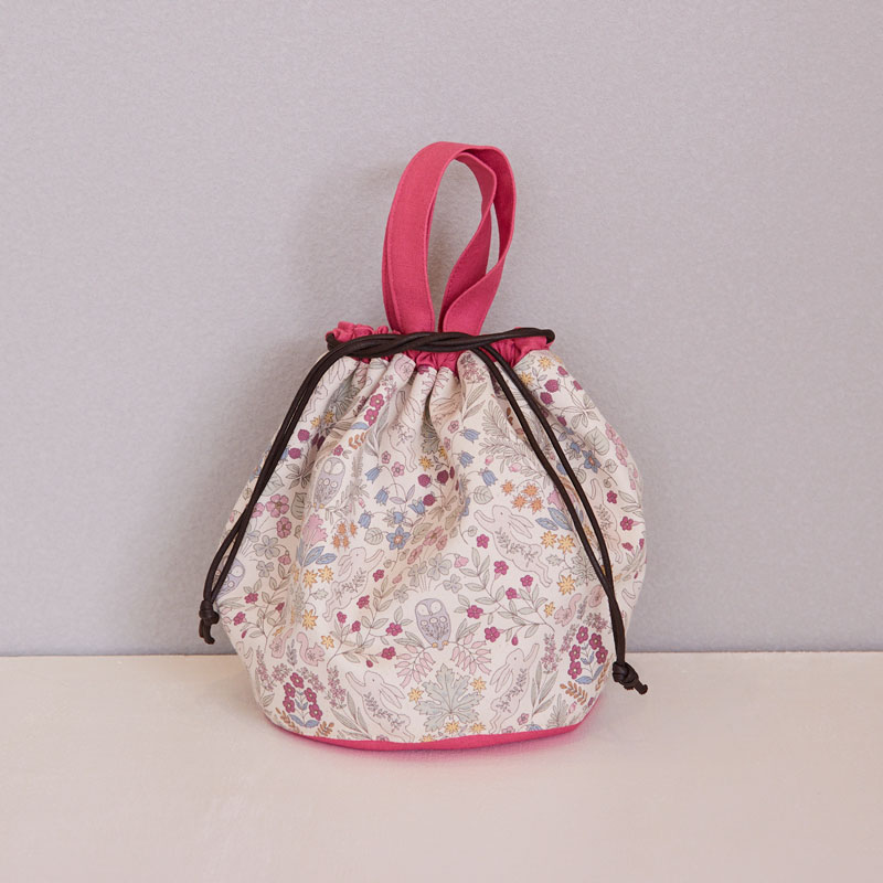 This drawstring bag has a lovely round shape and plenty of room with its circular bottom. The fabric used for this bag is from the “Linnea” series. Rabbits and owls are peeking out from amongst the flowers. This 100% cotton oxford is perfect for bag making.