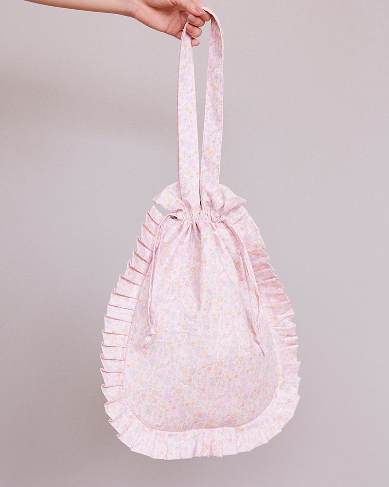 This is a drawstring bag with cute ruffles sewn all around the sides of the bag. The fabric used for this bag is from the “Dream Girl” series. Flowers and stuffed animals are drawn in soft and gentle colors. The cotton 100% sheeting is easy to handle even for sewing beginners. With the right amount of softness, this fabric is recommended for making a drawstring bag.
