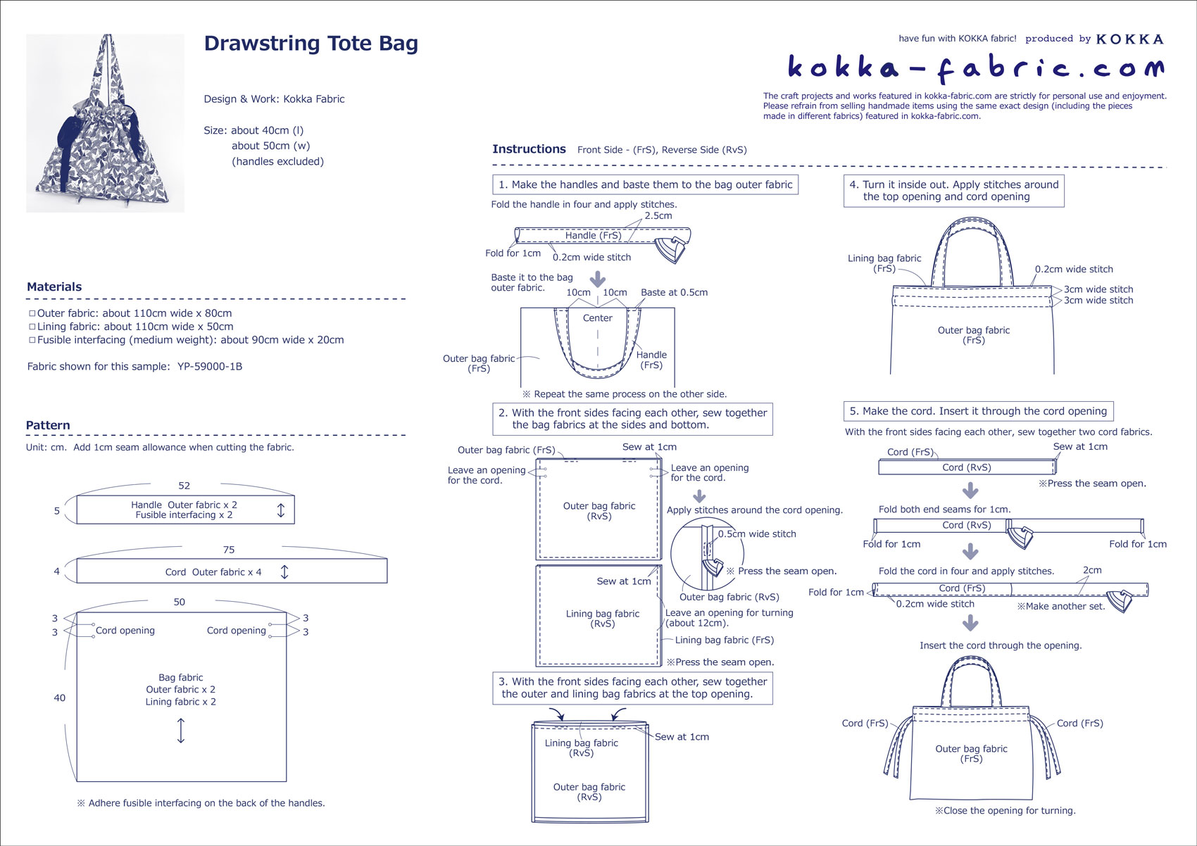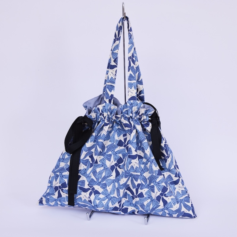 This is a cute drawstring tote bag tied with side ribbons. The fabric used for this bag is from the “BLACK CAWAII” series. It is a lovely fabric with a chic pattern of charming ribbons covering the entire surface. This easy-to-sew 100% cotton oxford is perfect for a variety of bag making.