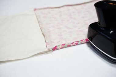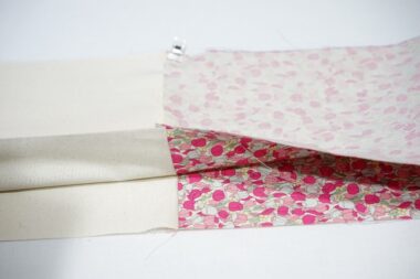 With the front sides facing each other, sew together the outer and lining fabrics at the top opening (1cm seam allowance)